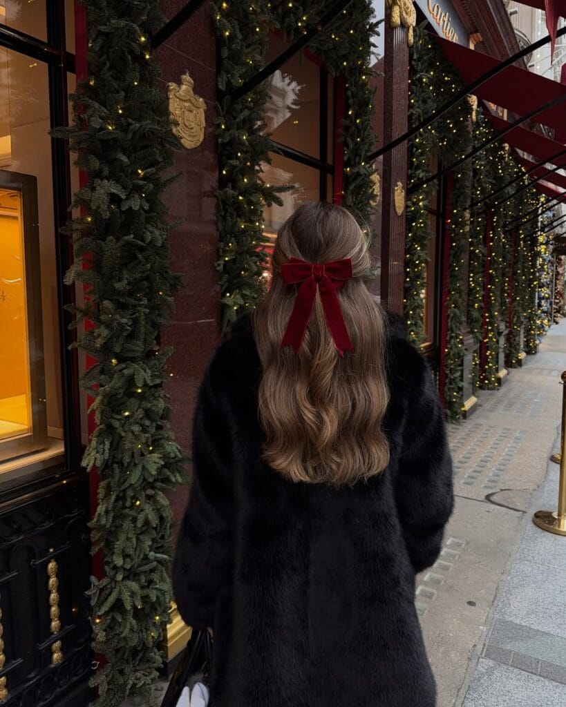 Lush brunette waves tumble down, topped with a dramatic black velvet bow for a touch of festive sophistication. The soft, voluminous curls and luxe ribbon create a dreamy, Pinterest-perfect Christmas hairstyle that shines beside sparkling holiday greenery.