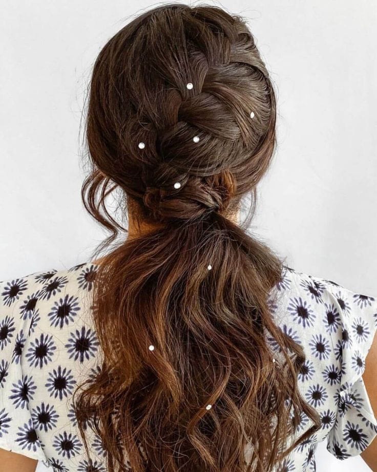 A loosely braided crown spills into tousled waves, adorned with delicate crystal pins that shimmer like tiny snowflakes. This hairstyle brings together effortless romance and festive winter magic, making it a dreamy, Pinterest-worthy choice for Christmas gatherings.