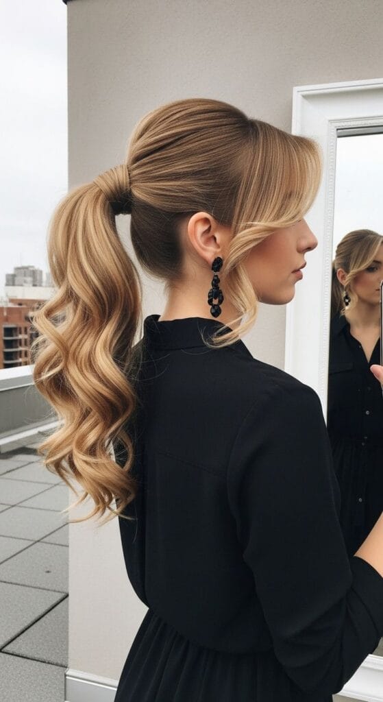 A voluminous blonde ponytail, styled with elegant, glossy curls, brings a modern, festive twist to classic holiday hair. The sleek wrap-over section at the base elevates this look with a polished finish, making it perfect for sparkling Christmas parties and dazzling Pinterest boards.