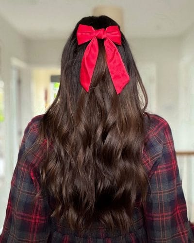 Rich brunette waves tumble down in glossy perfection, crowned by a bright cherry-red bow for a cheerful holiday statement. Paired with a cozy plaid dress, this simple half-up style gives Christmas magic and Pinterest-worthy vibes to any festive day.