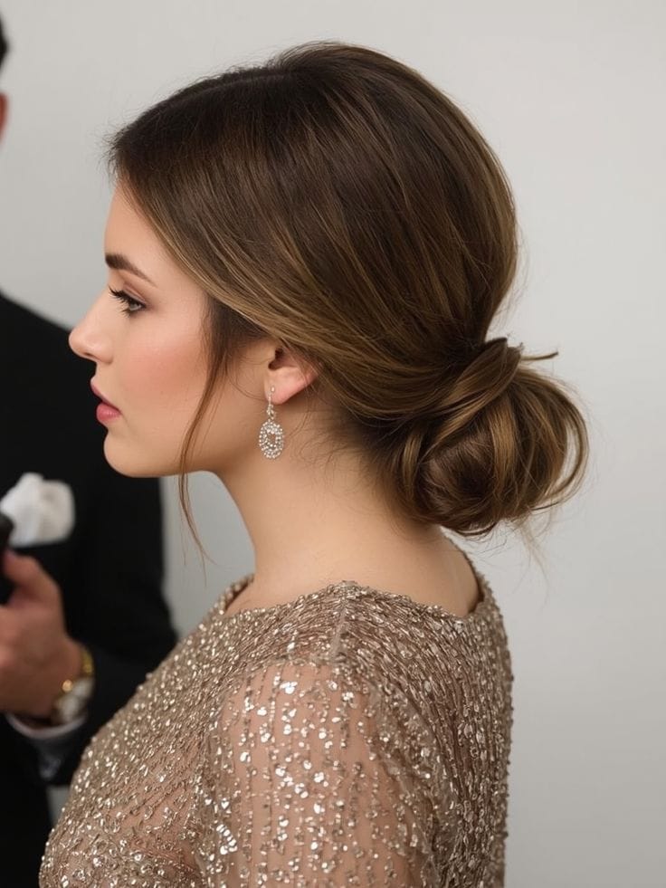 A soft, textured low bun glows with chestnut and honey hues, bringing sophisticated sparkle to festive gatherings. Paired with a shimmering dress and delicate earrings, this romantic updo is the perfect Christmas hairstyle for a refined, Pinterest-inspired evening look.