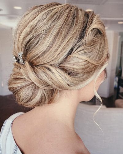 Champagne blonde strands are softly twisted into a romantic low updo, finished with a crystal hairpin that sparkles like fresh snow. Delicate front waves add softness and holiday magicāthe perfect elegant look for a Christmas soirĆ©e or festive family gathering.
