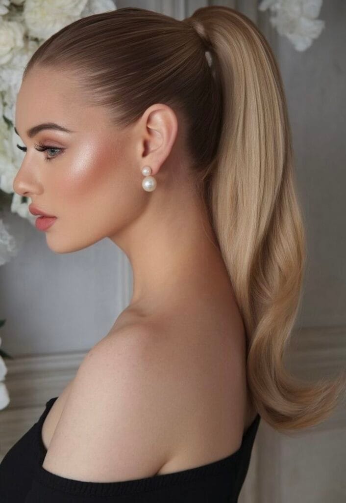 Sleek, honey-blonde hair is pulled into a wrapped high ponytail, shimmering with smooth, glassy shine. Elegant and modern, this ponytail is perfect for Christmas festivitiesāadding a hint of glamour and grace to every twirl on the dance floor.