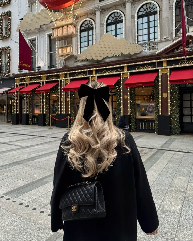Glossy champagne curls fall in soft, elegant waves beneath a bold black bow, radiating festive glamour for a Christmas soirĆ©e. The romantic half-up style sparkles under holiday lights, pairing perfectly with a classic evening dress for a look that’s both timeless and effortlessly Pinterest-chic.