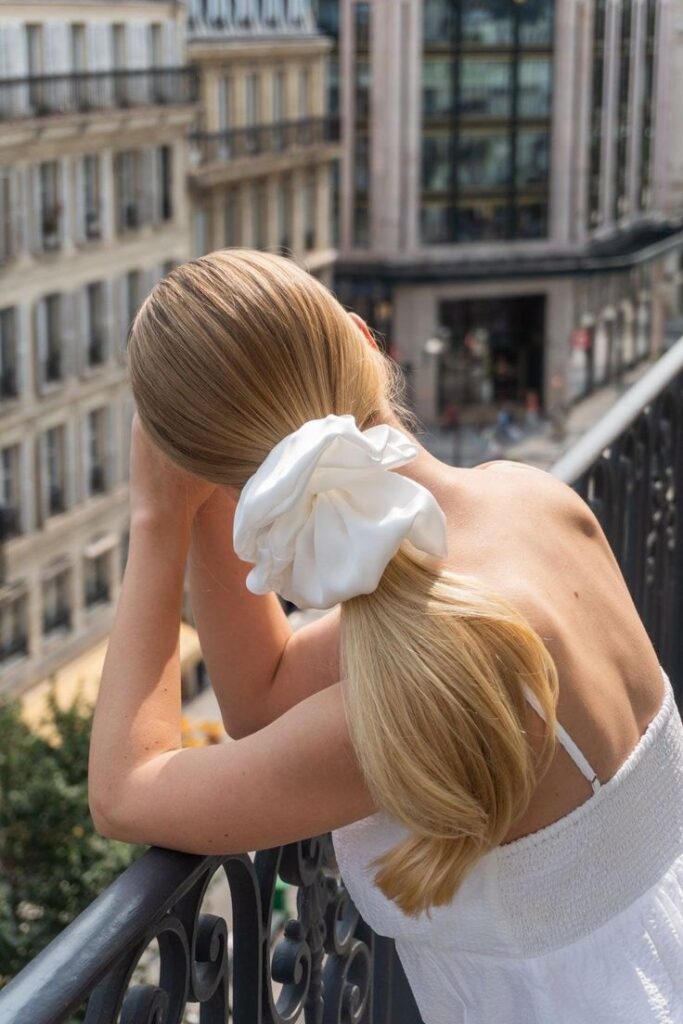 Sleek, golden hair is pulled into a low ponytail, finished with a plush white silk scrunchie for a playful winter touch. This crisp, clean style and frosty accessory create a cozy, festive lookāperfect for Christmas mornings spent sipping hot cocoa beside twinkling lights.