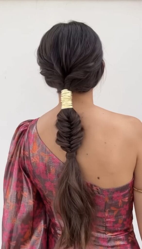 Rich brunette waves are swept into a textured fishtail braid, wrapped with glowing golden ribbon for a festive, regal finish. This intricate style radiates holiday luxury and warmth, making it a show-stopping look for Christmas parties and elegant family gatherings.