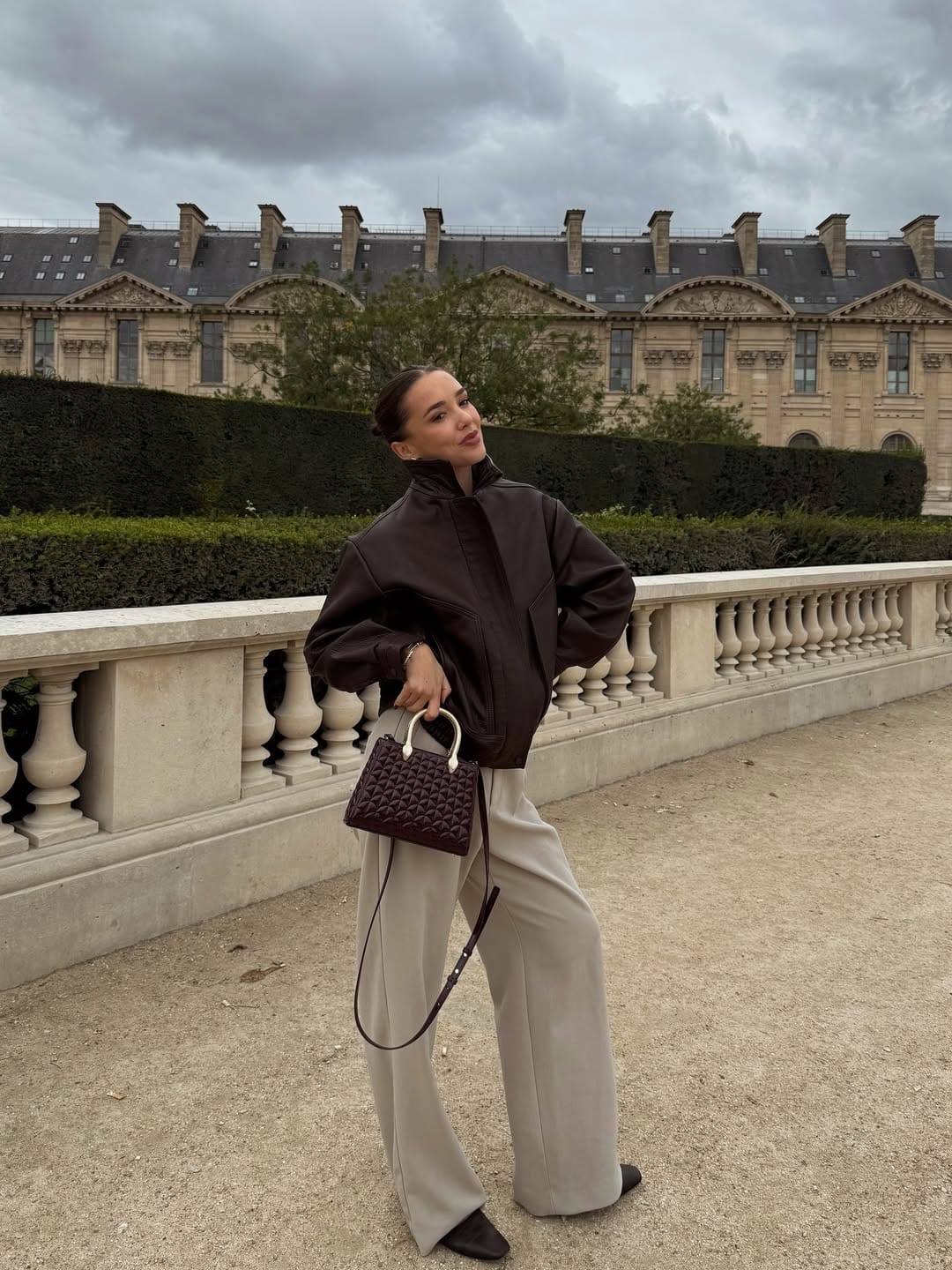 @ fleurraffanSheās serving cool city-country crossover in an oversized dark brown leather jacket paired with wide-leg light beige trousers for that relaxed, effortlessly polished vibe. Add in the structured mini top-handle bag and simple flats, and itās the perfect look for strolling through grand gardens while still feeling comfy.