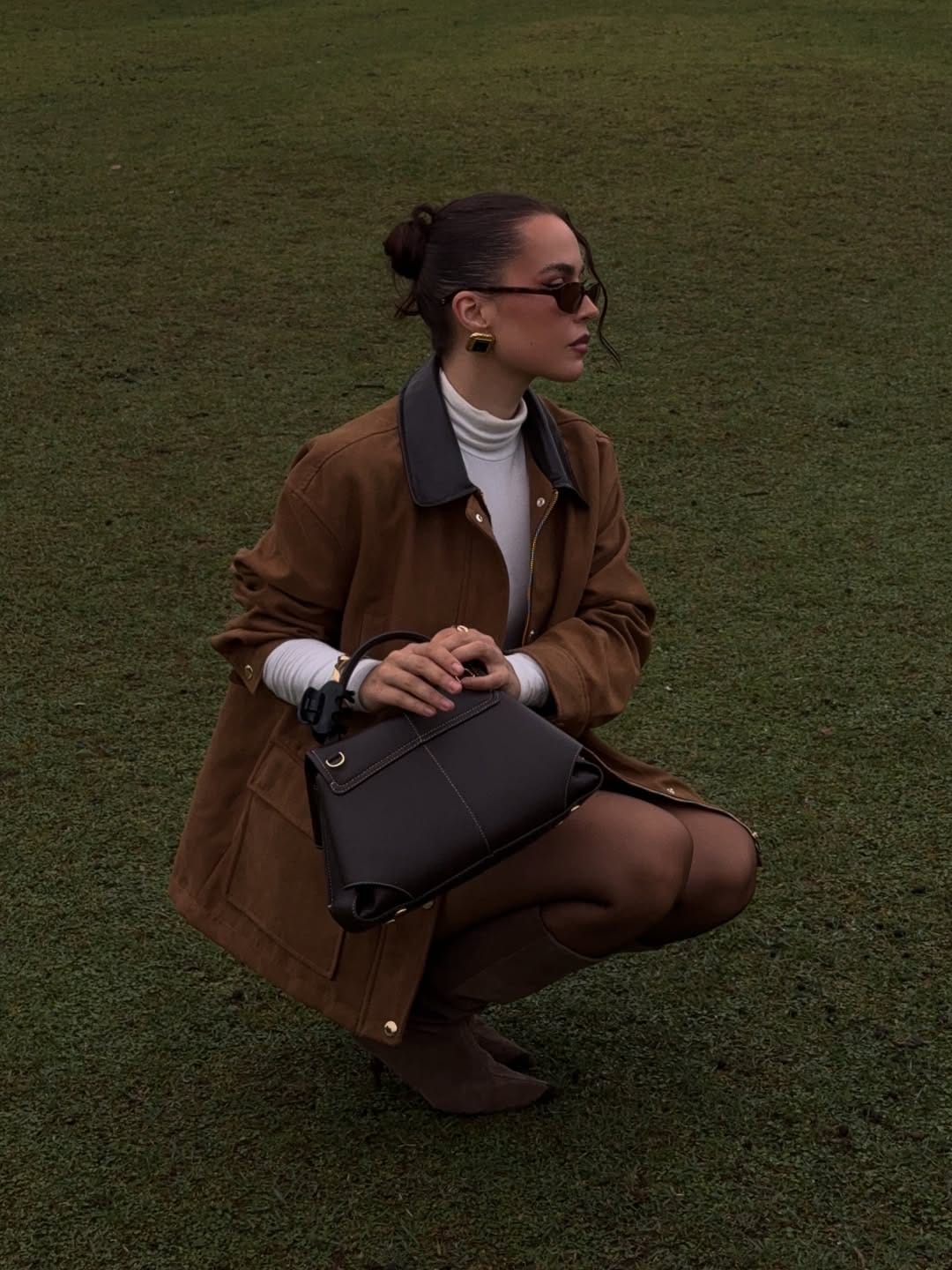 @ anna.weinSheās going full heritage chic in a tan suede field jacket layered over a crisp white turtleneck, paired with sheer tights for that soft, elegant contrast. Knee-high brown boots and a structured dark handbag pull the look together, like sheās ready for an afternoon wandering the grounds in serious style.