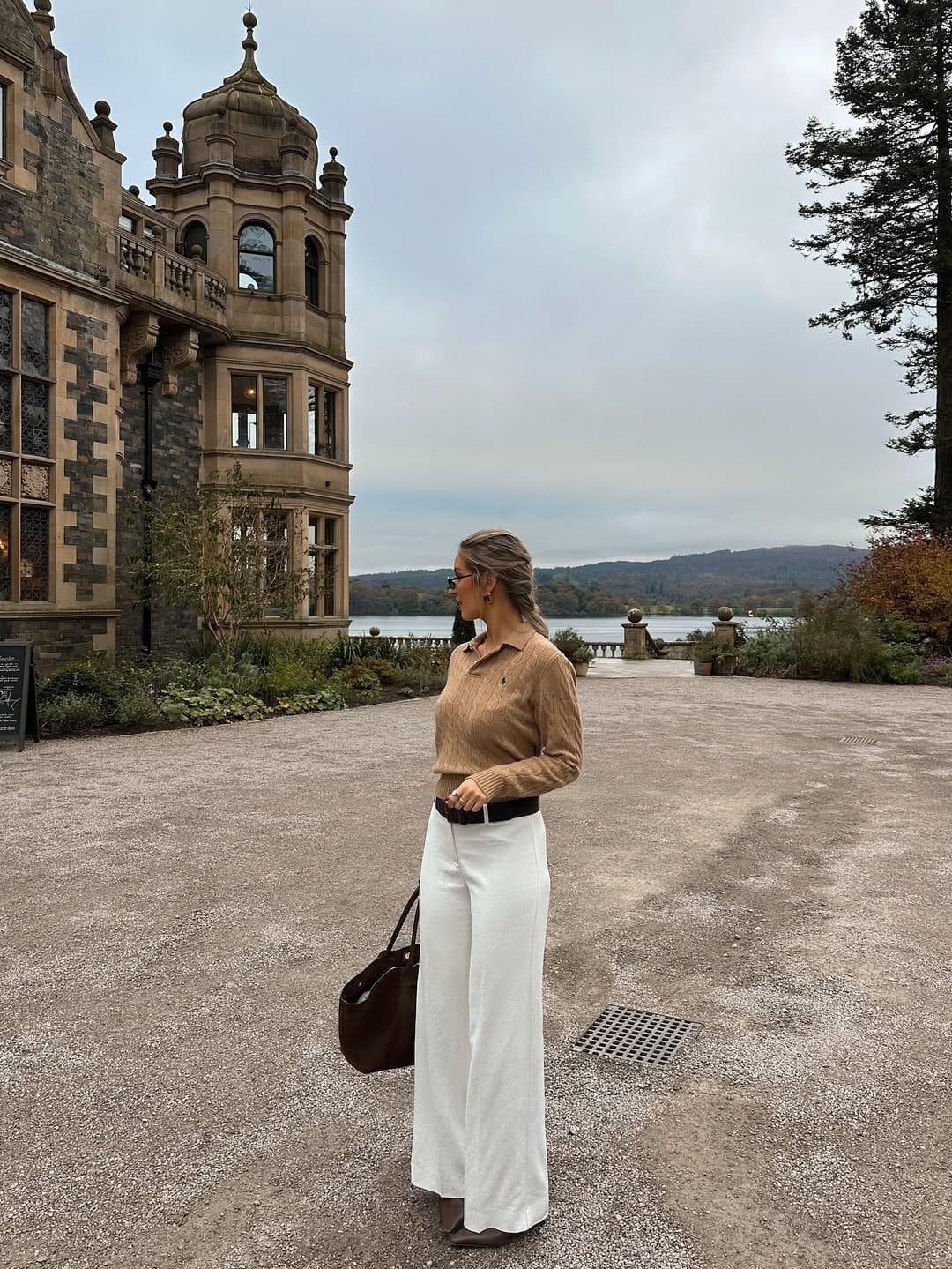 @ katherine_bonddThis look is all about cozy-meets-polished with a fitted camel knit top tucked into crisp white wide-leg pants for that effortless country chic vibe. It feels relaxed yet refined, like something youād wear for a countryside stroll but still look totally put together.