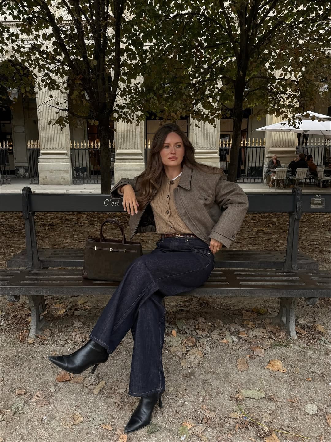 @ livia_auerSheās leaning into laid-back Parisian-country vibes with a boxy grey wool jacket over a camel button-up, paired with wide-leg dark-wash jeans for that perfectly slouchy-yet-polished feel. Pointed black ankle boots and a structured brown top-handle bag keep the whole bench-side moment chic and put-together.