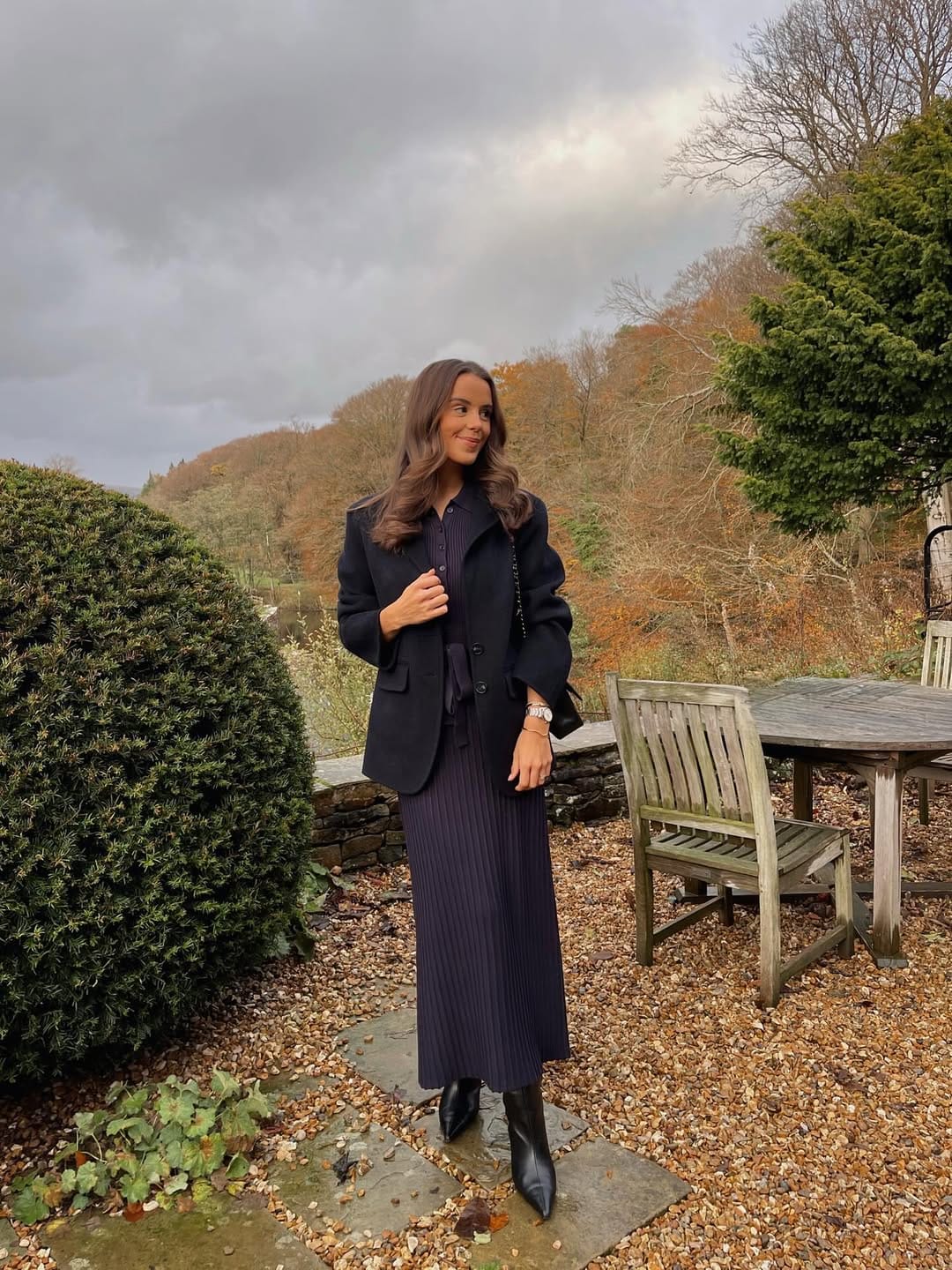 @ whatemworeSheās serving moody countryside sophistication in a black blazer layered over a deep charcoal button-up, flowing into a long ribbed knit skirt for a sleek column silhouette. Pointed black boots and a subtle chain-strap bag tie everything together, making this the ideal outfit for a cozy, dramatic walk before dinner.