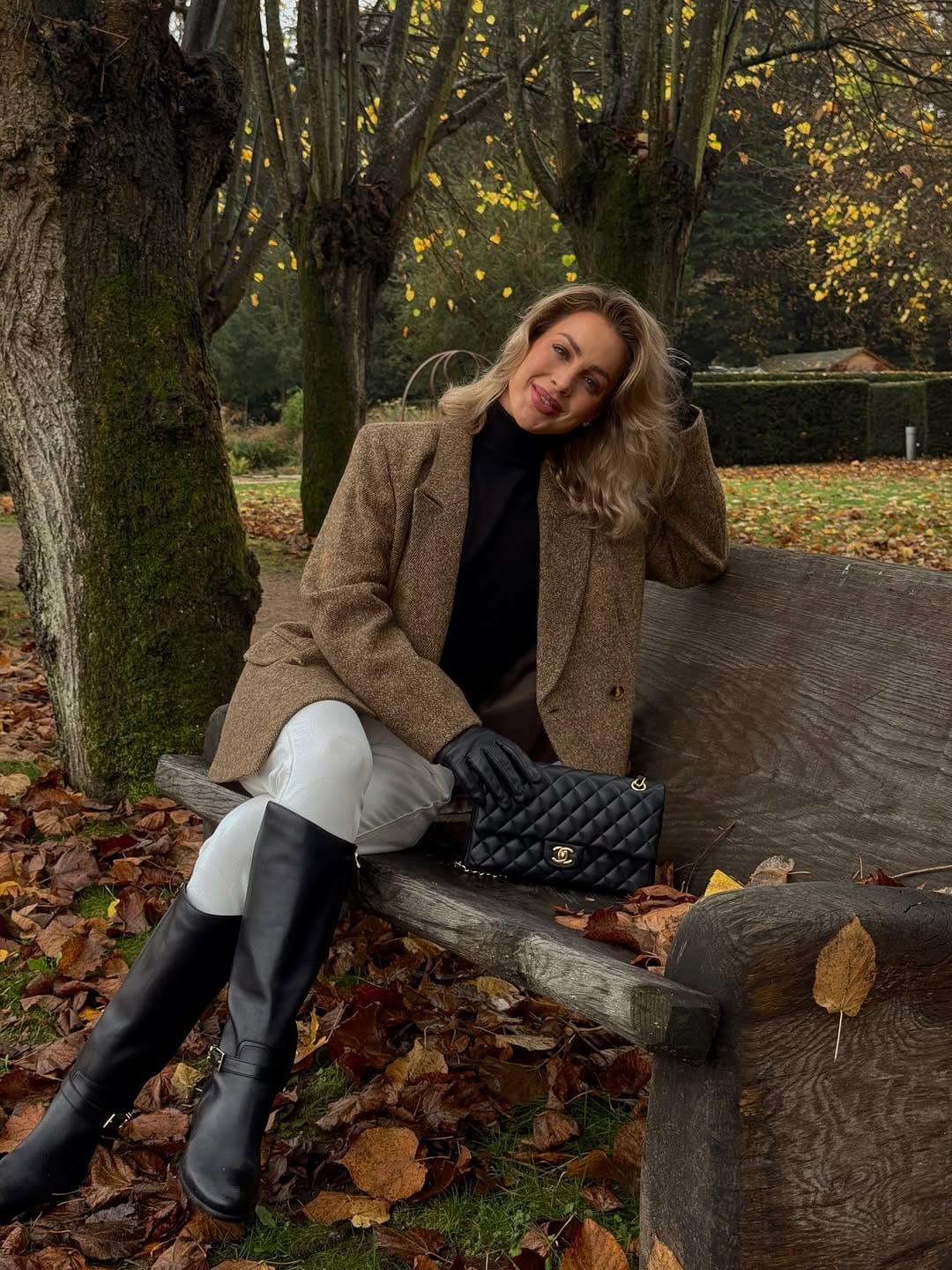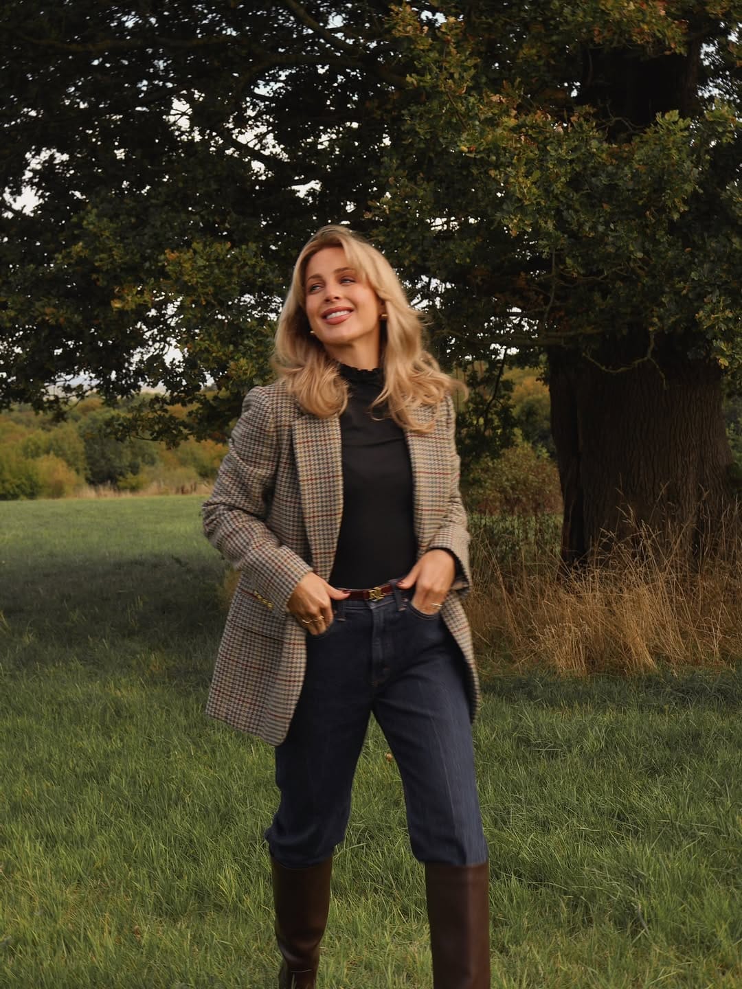 @ allchloeroseSheās wearing a tailored brown tweed blazer layered over a fitted black top, paired with crisp white pants for a timeless country chic look. Finished with tall black boots and leather gloves, it feels polished yet cozyāperfect for a stylish autumn day out.
