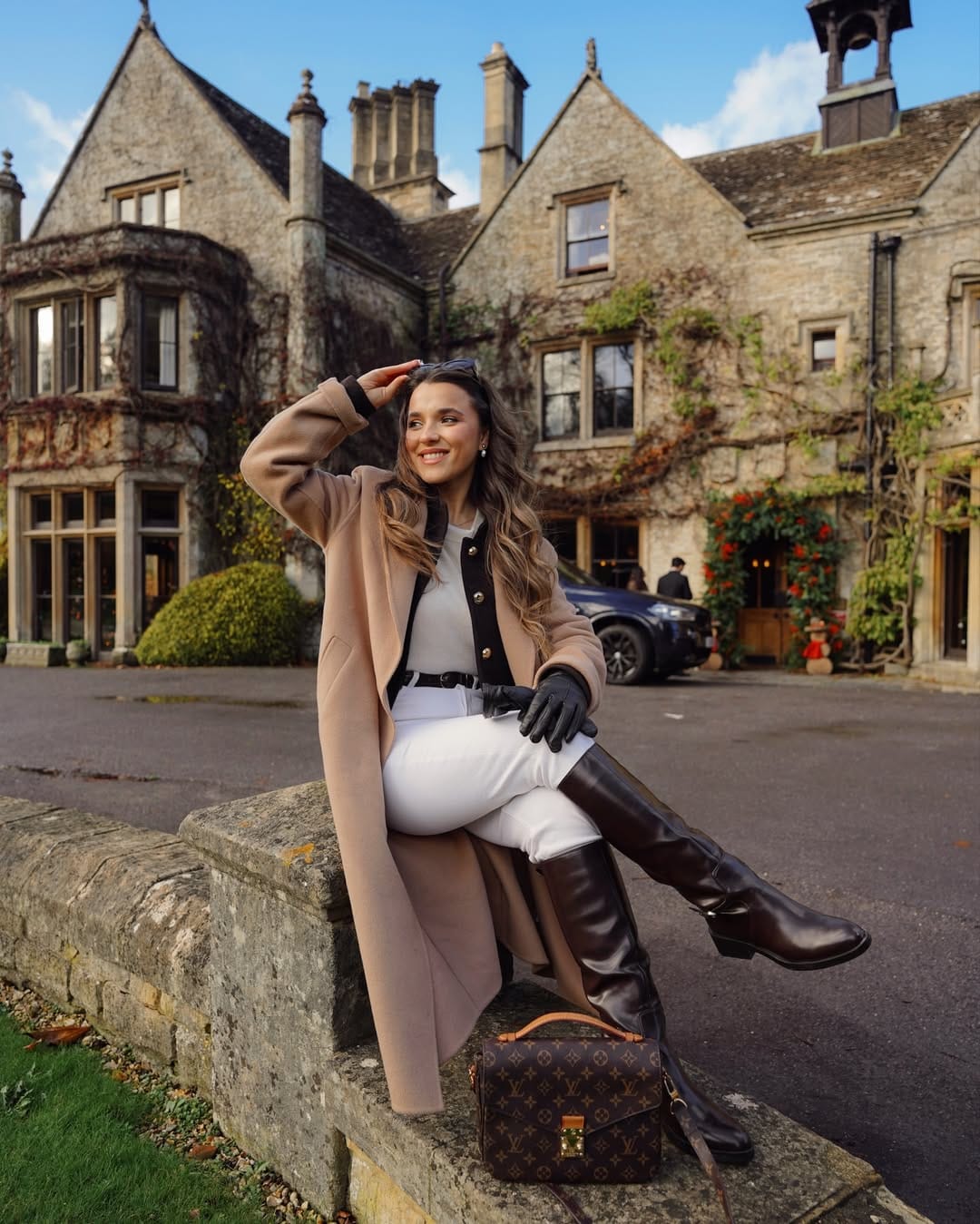 @ sophielouisesdiarySheās nailing layered preppy chic with a camel long coat draped over a checked double-breasted blazer, a soft camel knit, and a crisp white shirt peeking out at the collar and cuffs. Slim dark trousers and classic black riding boots keep the outfit sleek and timeless, perfect for wandering grand terraces with a coffee in hand.