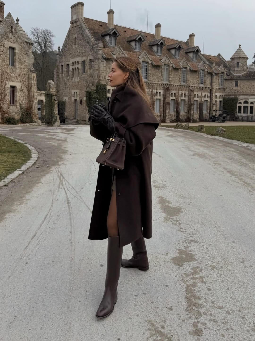 @ lovisabarkmanSheās serving full-on gothic countryside romance in a long dark brown cape coat, styled with matching knee-high riding boots for that sweeping, dramatic silhouette. The black gloves and structured top-handle bag make it look like sheās gliding through an old estate on her way to a very chic secret rendezvous.