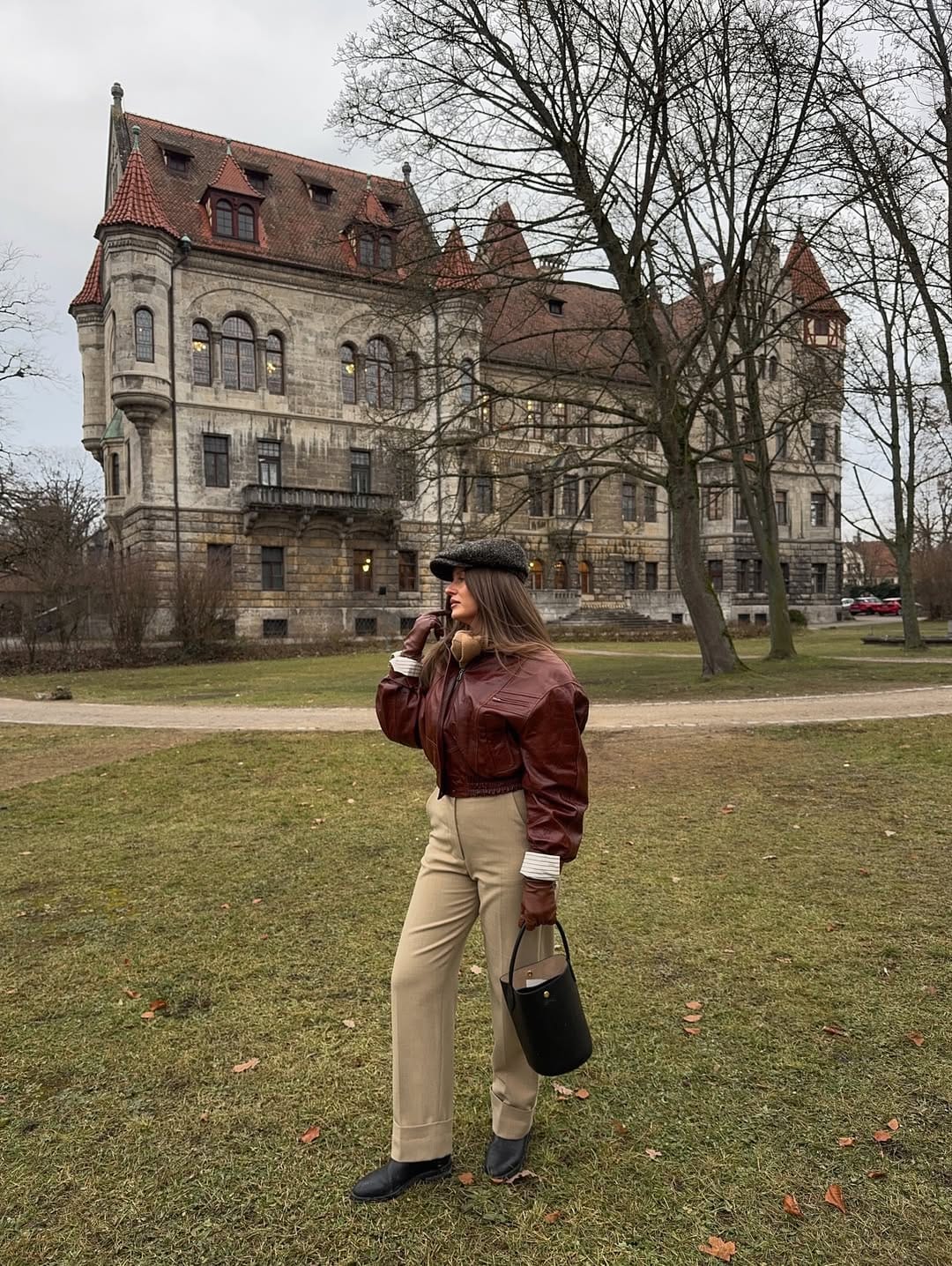 @ livia_auerSheās going retro-country chic in a rich brown cropped leather jacket layered over a neutral knit, paired with straight-leg beige trousers for that effortless, leg-lengthening look. Simple black ankle boots and a structured bucket-style bag keep it all feeling polished for a stroll around the estate.