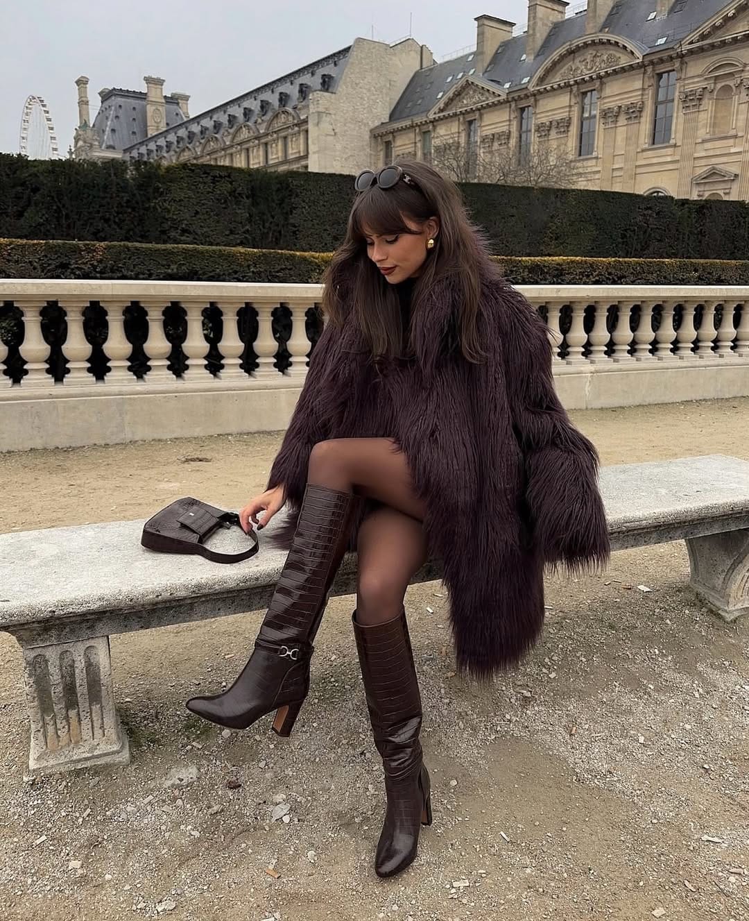 @ jodielapetitefrenchieSheās serving full-on luxe drama in a deep chocolate faux-fur coat, worn over sheer tights to let those knee-high embossed boots completely steal the show. The matching dark mini bag and oversized sunglasses make this bench moment feel like a glamorous winter editorial in the middle of the city.