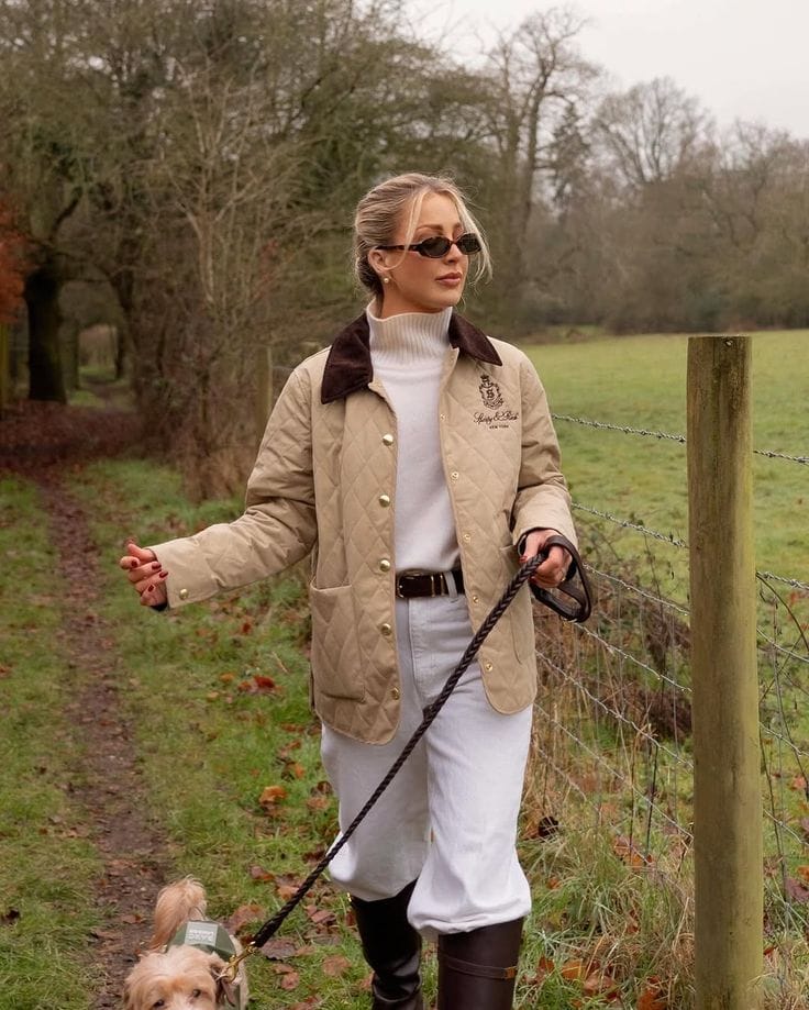 @ allchloeroseSheās weekend-walk ready in a cream turtleneck tucked into crisp white jodhpurs, topped with a beige quilted jacket featuring a contrasting brown collar for that timeless country look. Dark brown riding boots, a sleek belt, and her pup in tow make this outfit feel like the dreamiest countryside stroll ever.