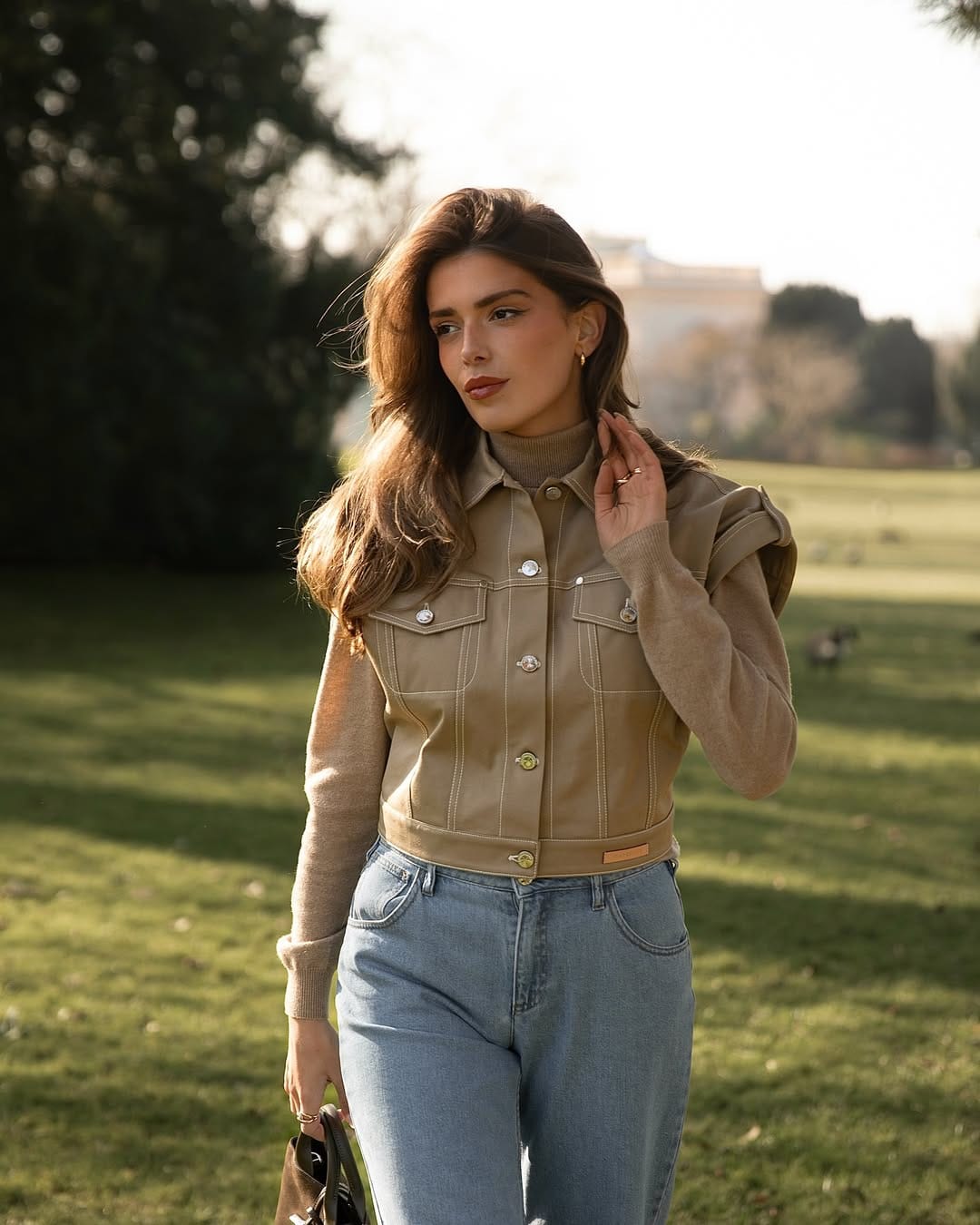 @ heloise.guilletSheās keeping it modern-country in a tan structured vest layered over a slim beige knit, styled with high-waisted light-wash jeans for that effortless, off-duty countryside stroll. The tonal top half and relaxed denim make it feel elevated but still super easy to recreate for a park walk or brunch date.