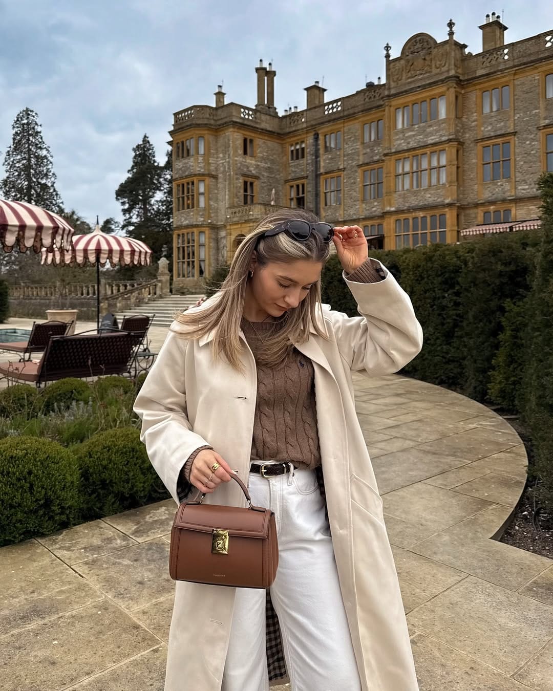 @ lilyisabellaclarkSheās serving luxe manor-weekend energy in a long cream trench coat over a chunky chocolate cable-knit sweater, tucked into crisp white jeans for a fresh, high-contrast look. The rich brown accents and tailored coat give the whole outfit that polished, āI just stepped out of a countryside hotelā vibe.