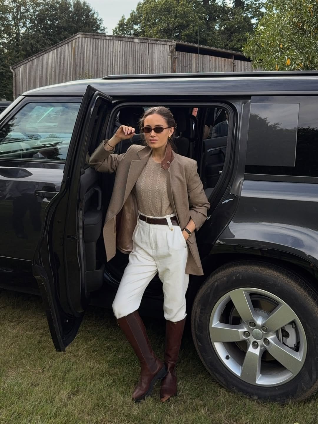 @ kateehutchinsSheās wearing a soft cable-style knit top layered under a structured neutral blazer, paired with relaxed white pants for that effortless country chic balance. Finished with tall brown boots and sleek sunglasses, it feels classic, confident, and perfect for a countryside weekend look.