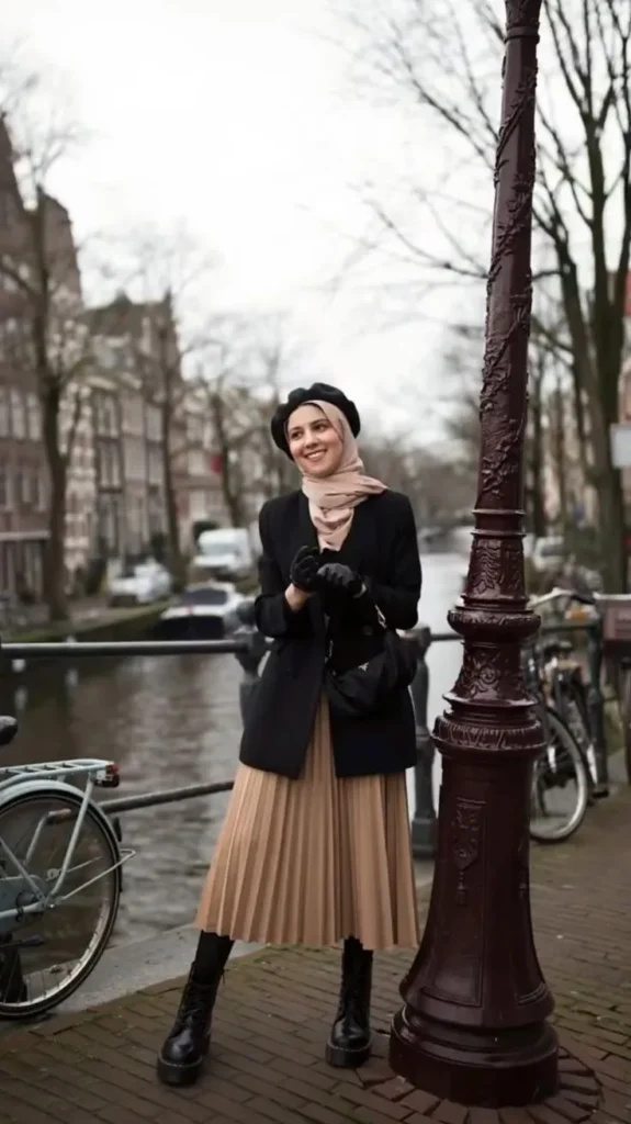 This outfit features a sophisticated blend of a pleated camel skirt and a tailored black blazer. Paired with black lace-up boots and a beret, it’s perfect for a classy winter stroll. The neutral tones and the scarf add warmth while maintaining elegance.