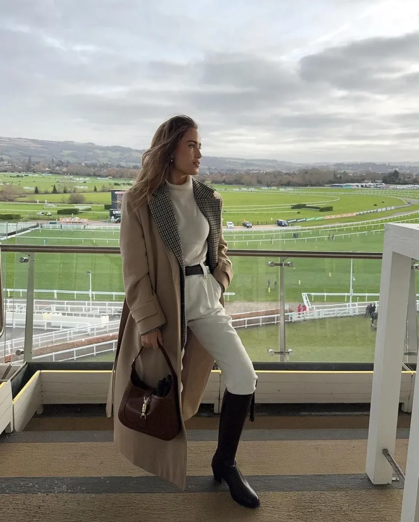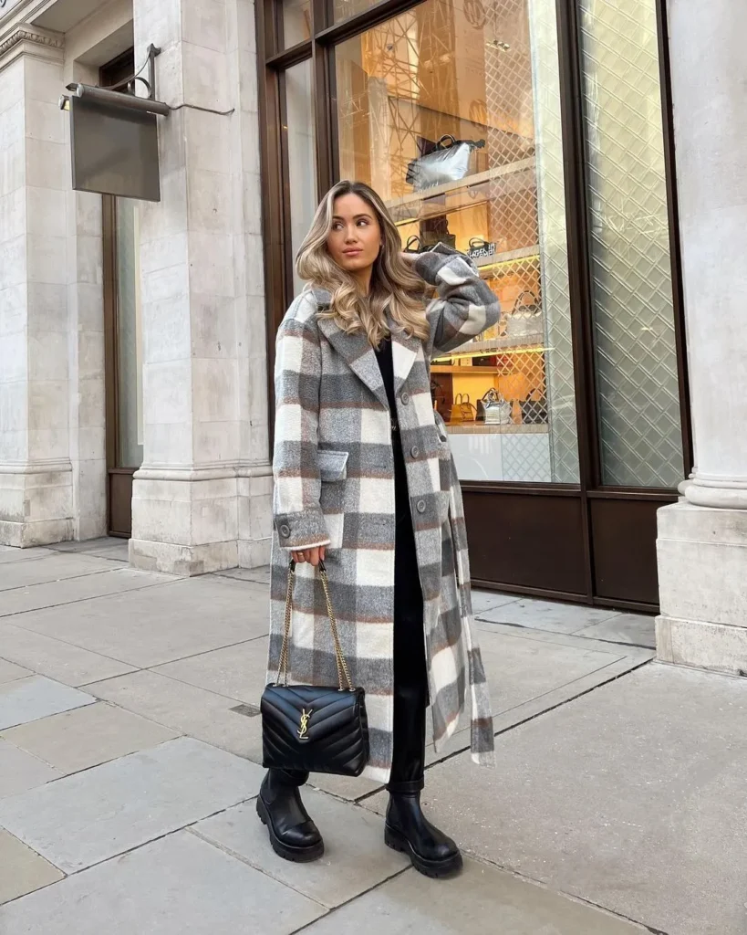 This casual yet stylish outfit pairs a checkered overcoat with a neutral hoodie and joggers. Paired with combat boots and a sleek handbag, it’s ideal for a relaxed winter day with a touch of sophistication.
