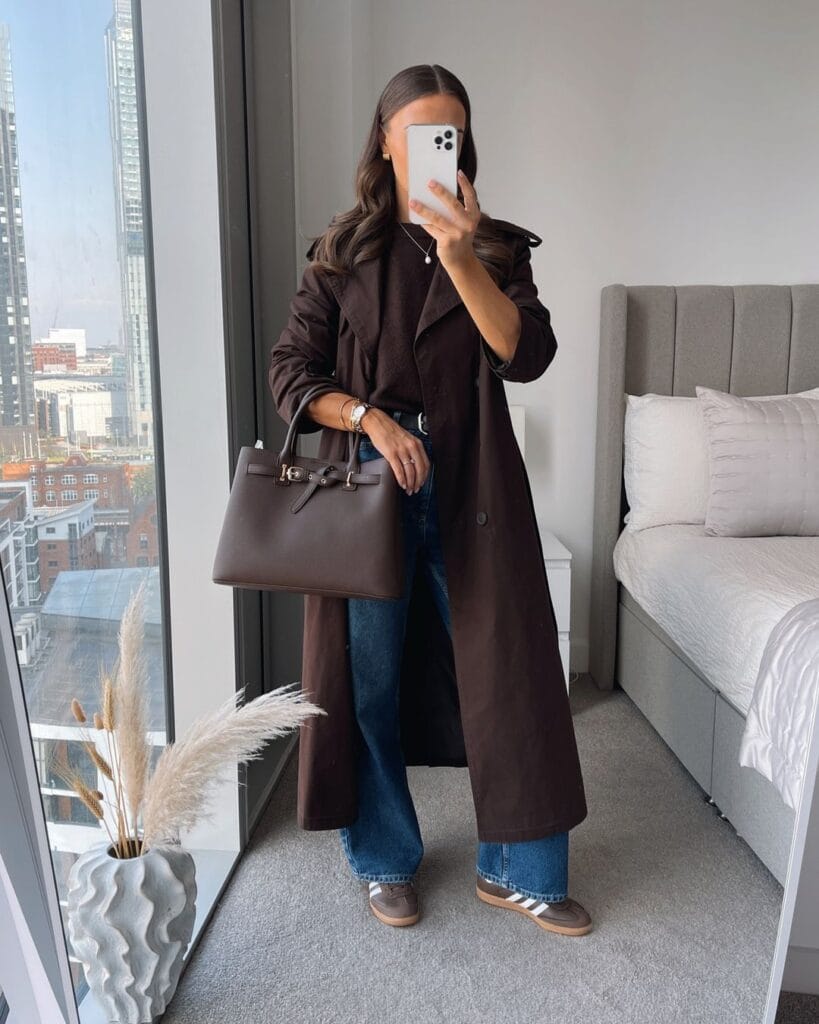 @ whatemworeA dark brown trench coat layered over casual jeans and sneakers makes this outfit a blend of comfort and style. The brown leather handbag adds a touch of elegance to this laid-back winter look.