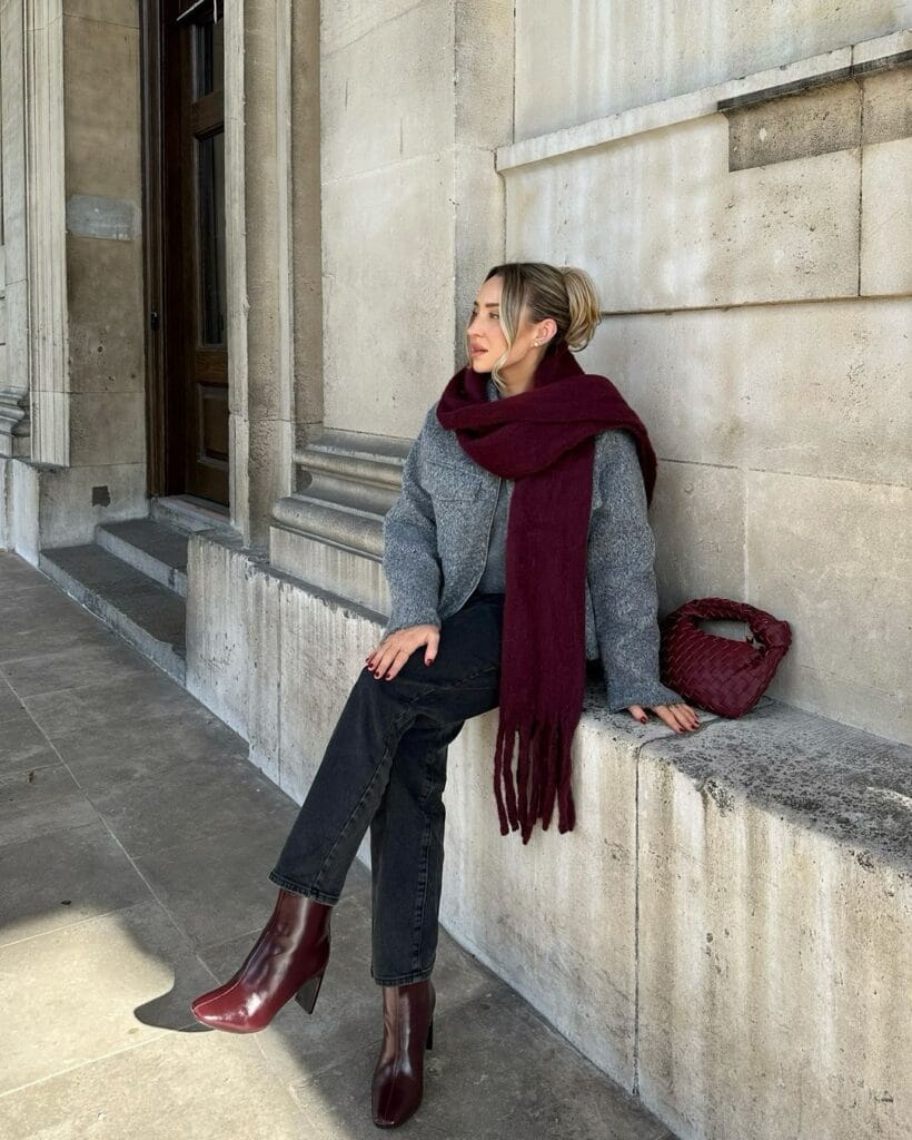 @ freyakillinFeaturing a gray textured jacket and black jeans, this look is elevated with burgundy ankle boots and a matching scarf. Perfect for casual outings in winter, this outfit blends warmth with sophistication.