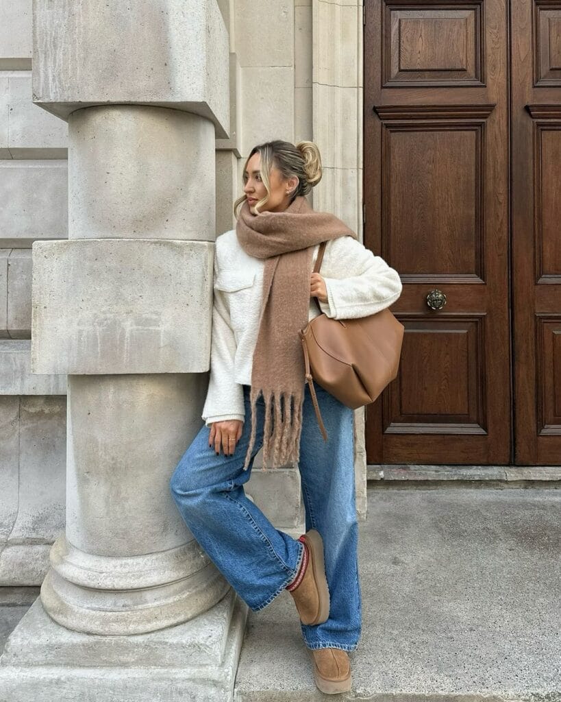@ freyakillinThis cozy look includes a cream sweater paired with light blue jeans and tan boots. The oversized beige scarf and matching tan handbag complete the casual yet polished winter style.