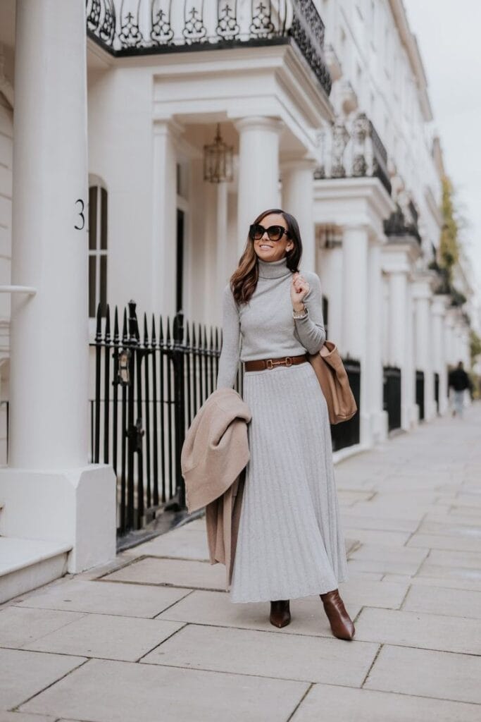 A ribbed gray maxi dress paired with brown ankle boots and a matching brown belt creates a clean and elegant silhouette. The neutral tones make it a versatile choice for any winter day.