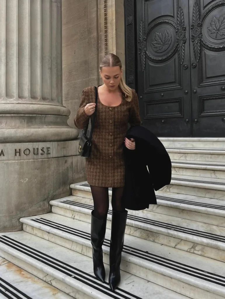 @ mildagudA brown check mini dress paired with pointed-toe boots creates a playful yet polished winter look. Add tights for extra warmth and style for a cozy-chic vibe.