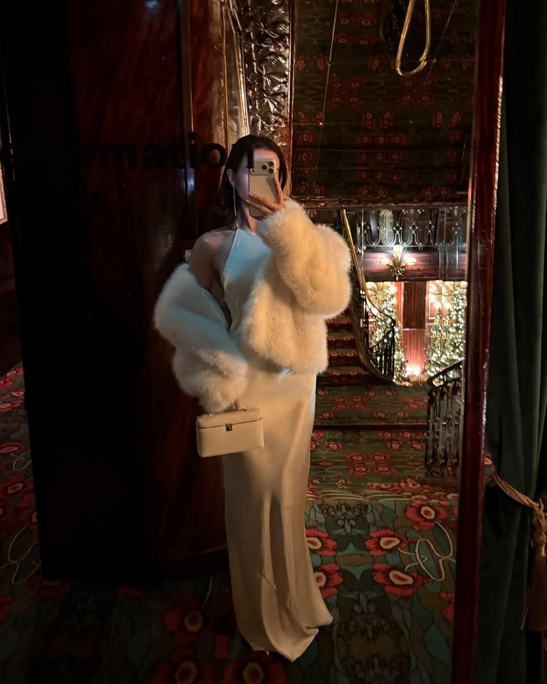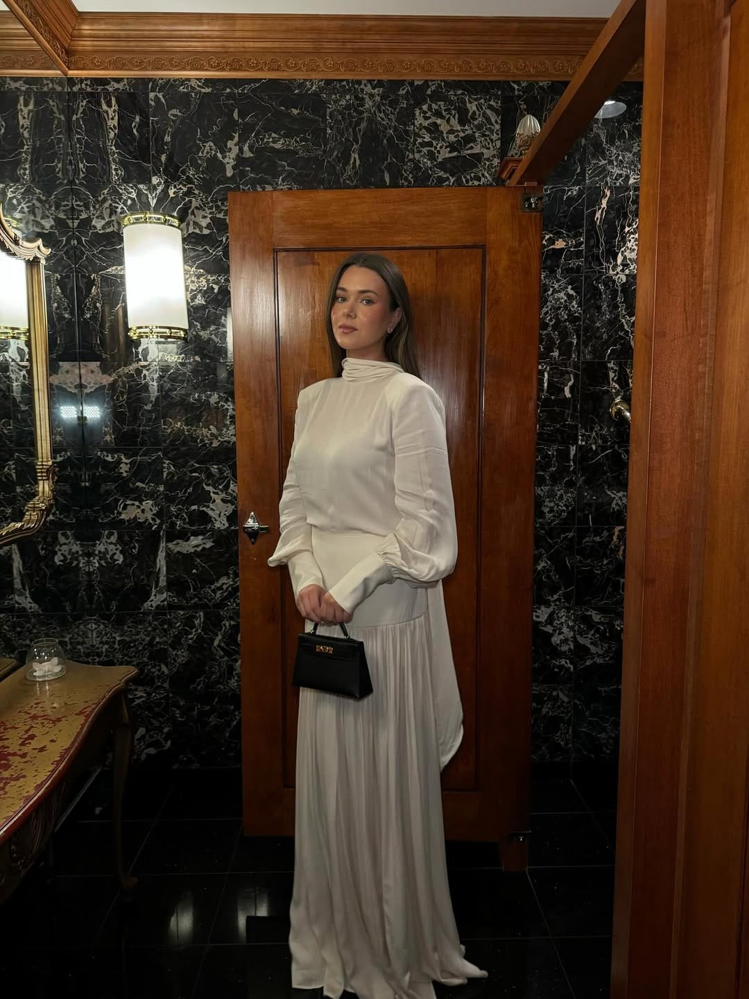 @ sophiesuchanShe’s keeping it elegant in a silky ivory high-neck blouse paired with a matching floor-length satin skirt, giving that soft, romantic glow. The look is finished with minimal jewelry and a structured black mini bag for a chic, evening-ready vibe.