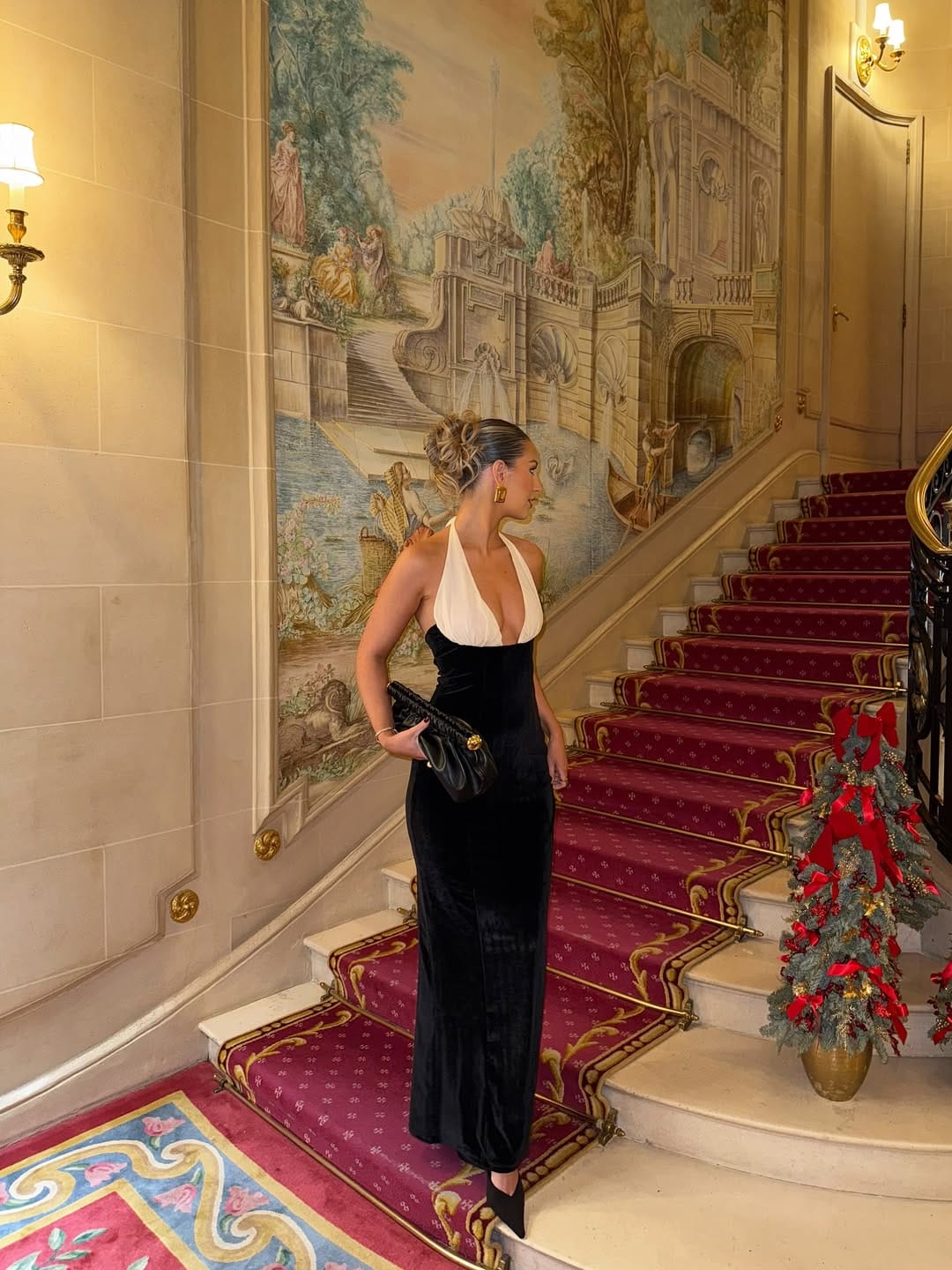 @ katherine_bonddShe dons a striking black velvet halter gown with a crisp white bust panel and deep V-neckline. The luxurious fabric drapes into a fitted, floor-length silhouette perfect for date night allure.
