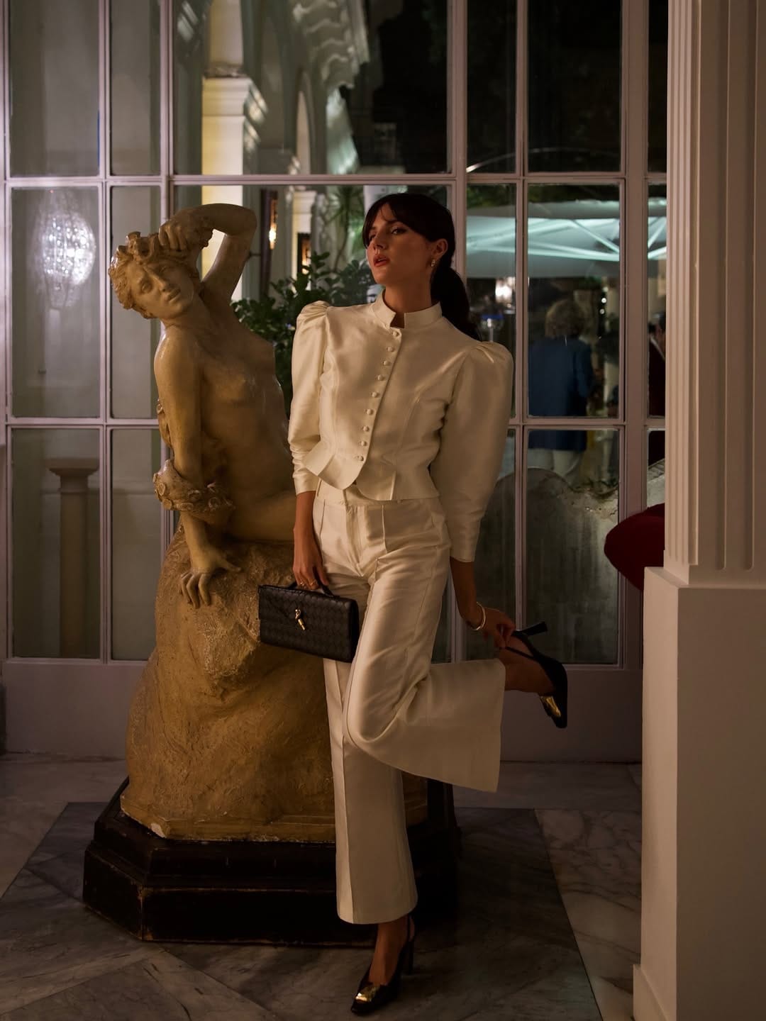 @ paola_cossentinoShe sports a pristine white cropped blazer with dramatic puffed sleeves and matching mandarin collar over wide-leg trousers. The tailored set exudes tailored elegance ideal for elevated date nights.