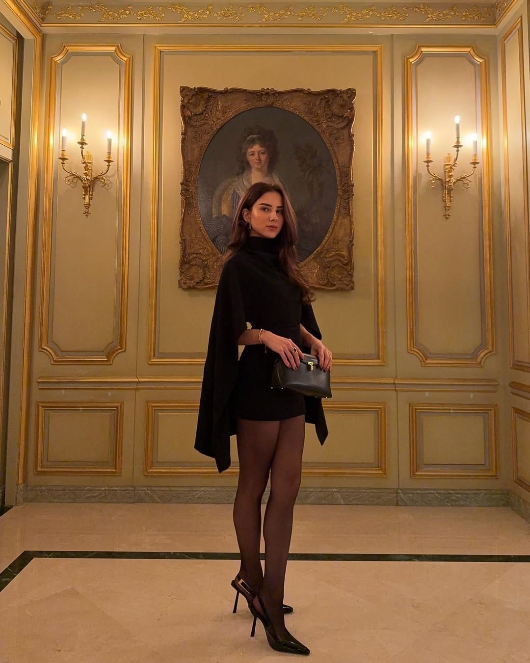 @ lucygrasssoShe wears a sleek black high-neck mini dress with flowing cape sleeves. The form-fitting style paired with sheer panels crafts a mysterious, captivating date night ensemble.