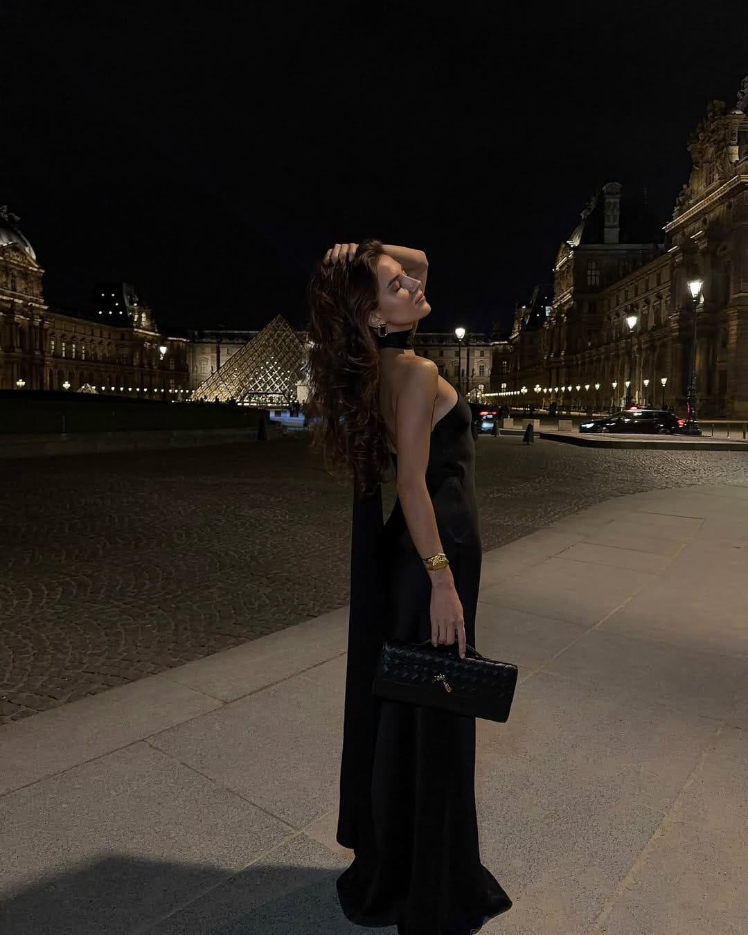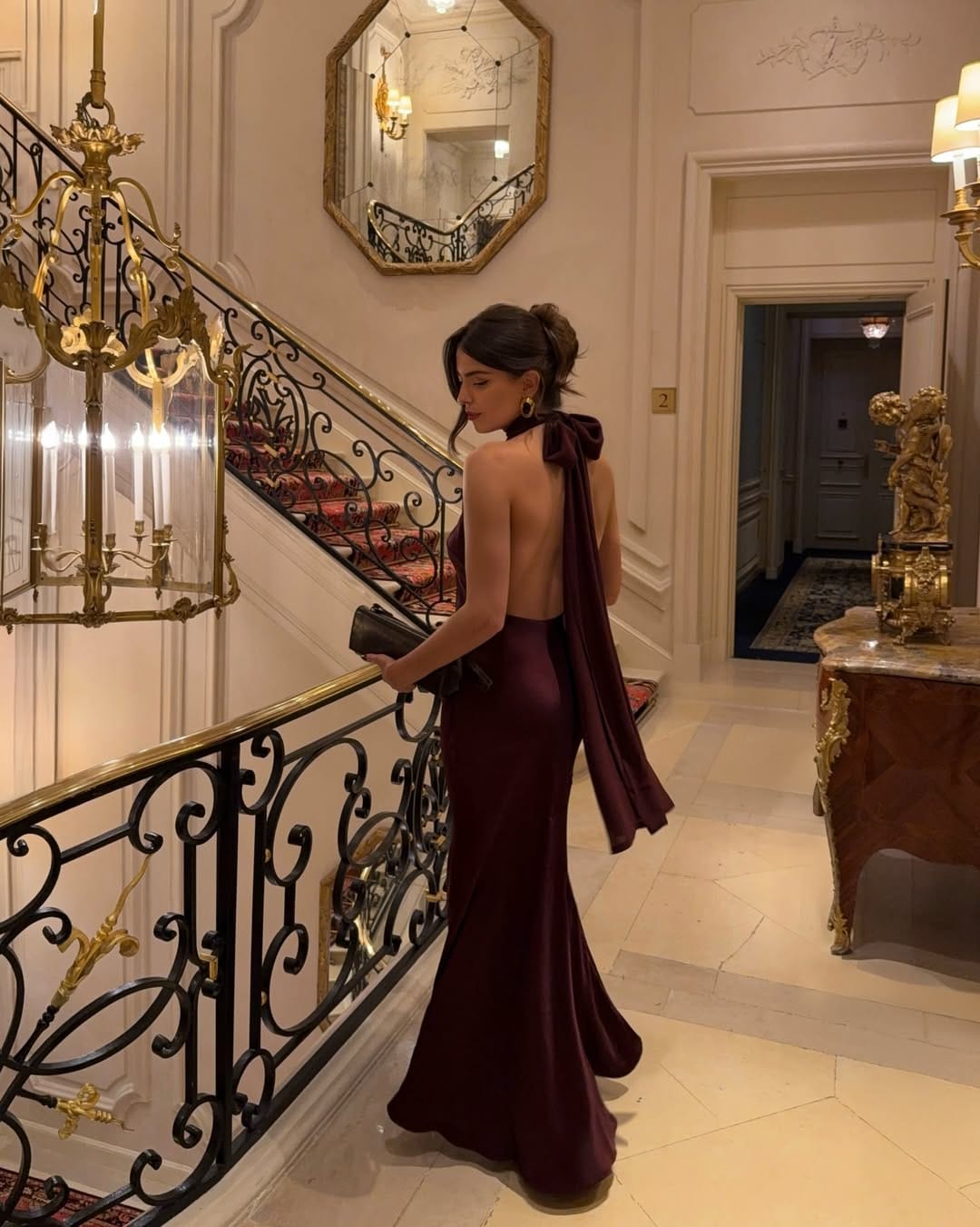 @ heloise.guilletShe’s turning heads in a rich burgundy satin gown featuring a daring backless design and dramatic bow tie detail, flowing into a glamorous floor-length silhouette. Stud earrings and a red clutch add the perfect finishing touch for date night magic.