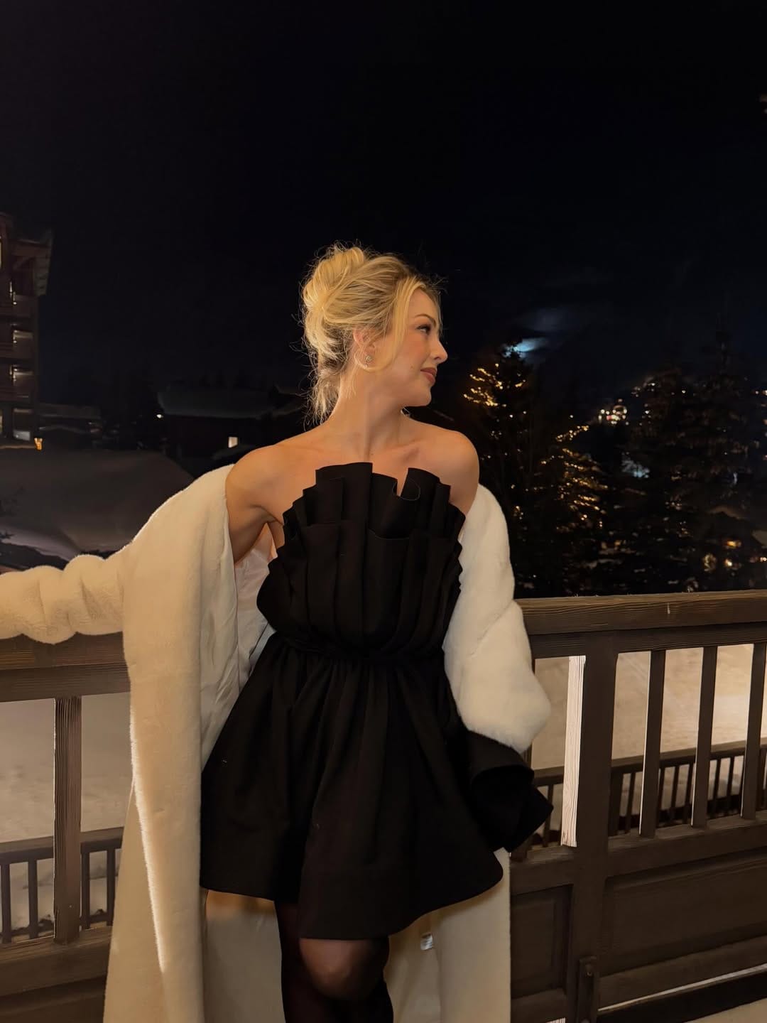 @ allchloeroseShe wears a striking black off-shoulder mini dress with exaggerated ruffled shoulders and peplum waist. A creamy faux fur coat drapes over for cozy yet glamorous date night layering.