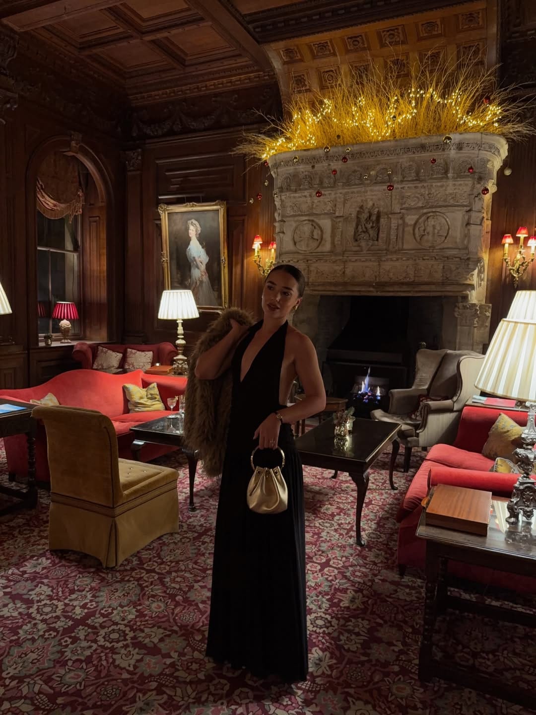 @ fleurraffanShe wears a sleek black halter gown that drapes elegantly to the floor. A plush faux fur stole drapes over her shoulders for added opulence and warmth.