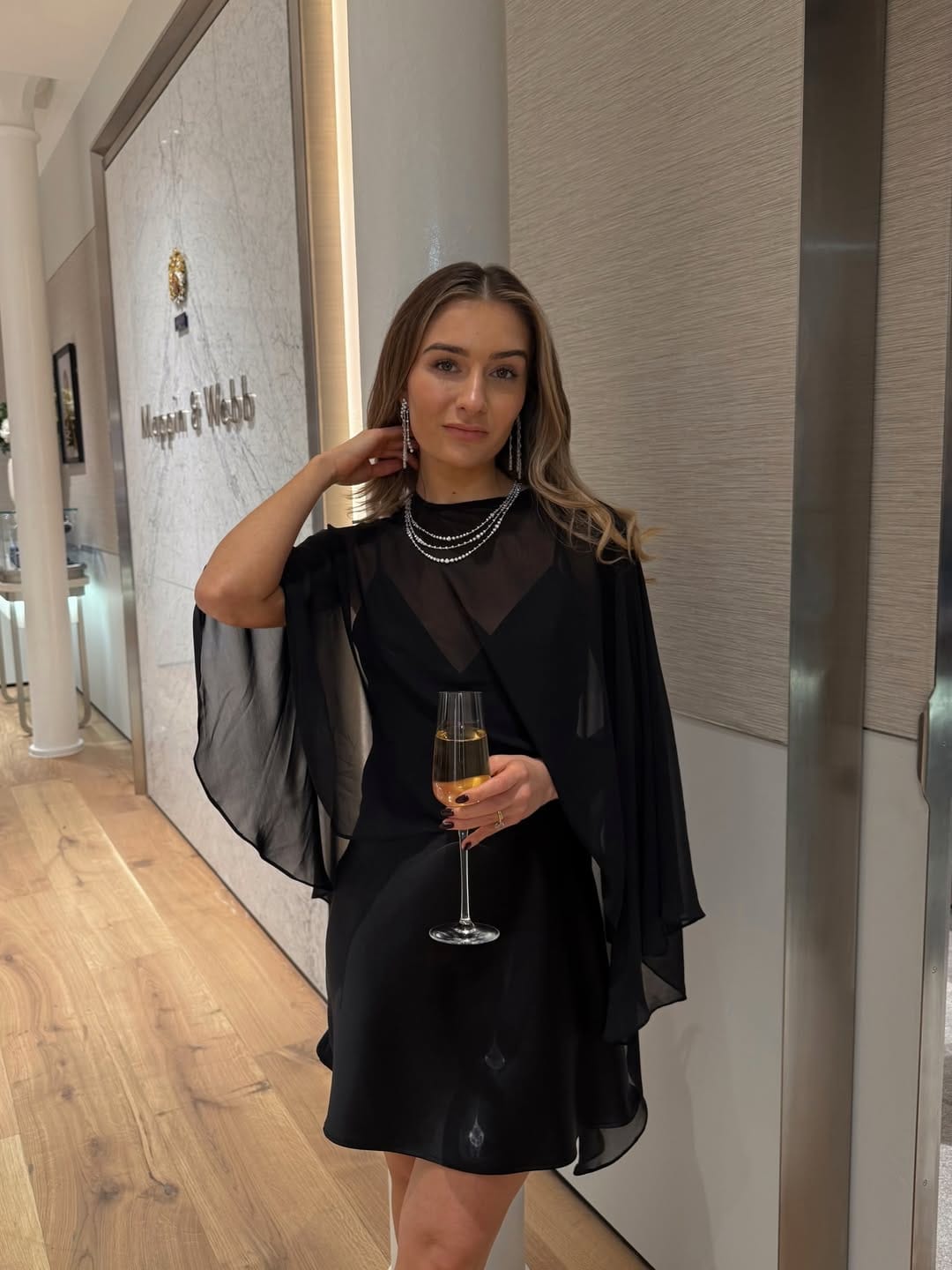 @ lilyisabellaclarkShe wears a chic black mini dress topped with a flowing sheer cape overlay for soft, romantic movement. Light, draped sleeves and a gently flared skirt create an effortlessly elegant date night silhouette.