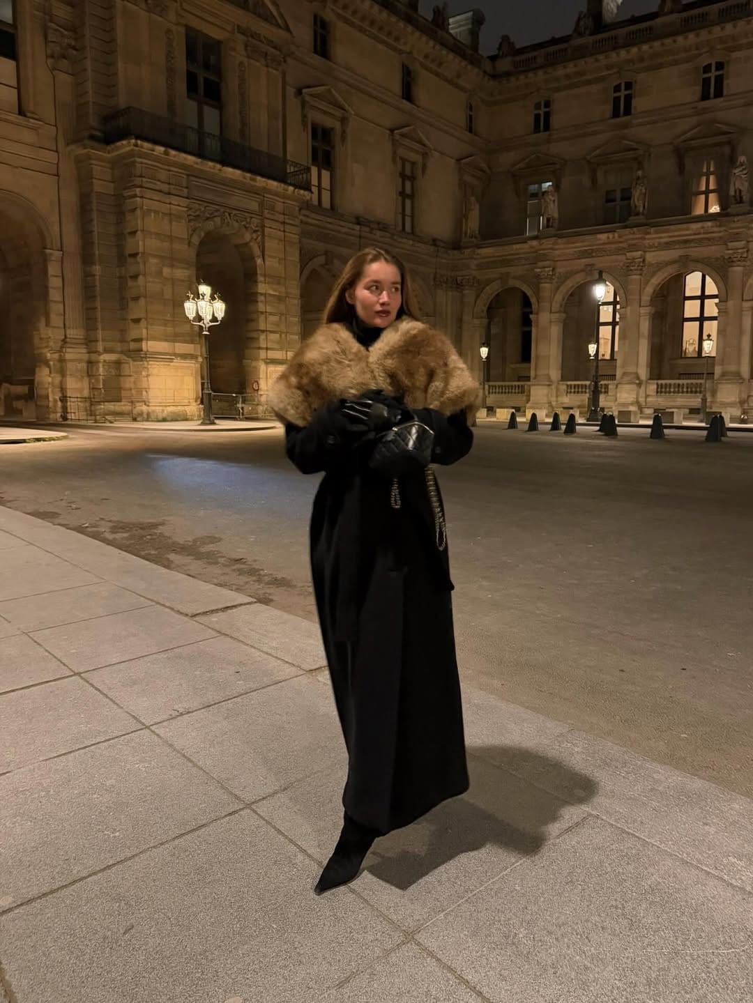 @ lovisabarkmanShe wears a long black coat with a dramatic fur collar for luxurious warmth and structure. The tailored silhouette flows to the ankles, paired with a sleek black turtleneck underneath.