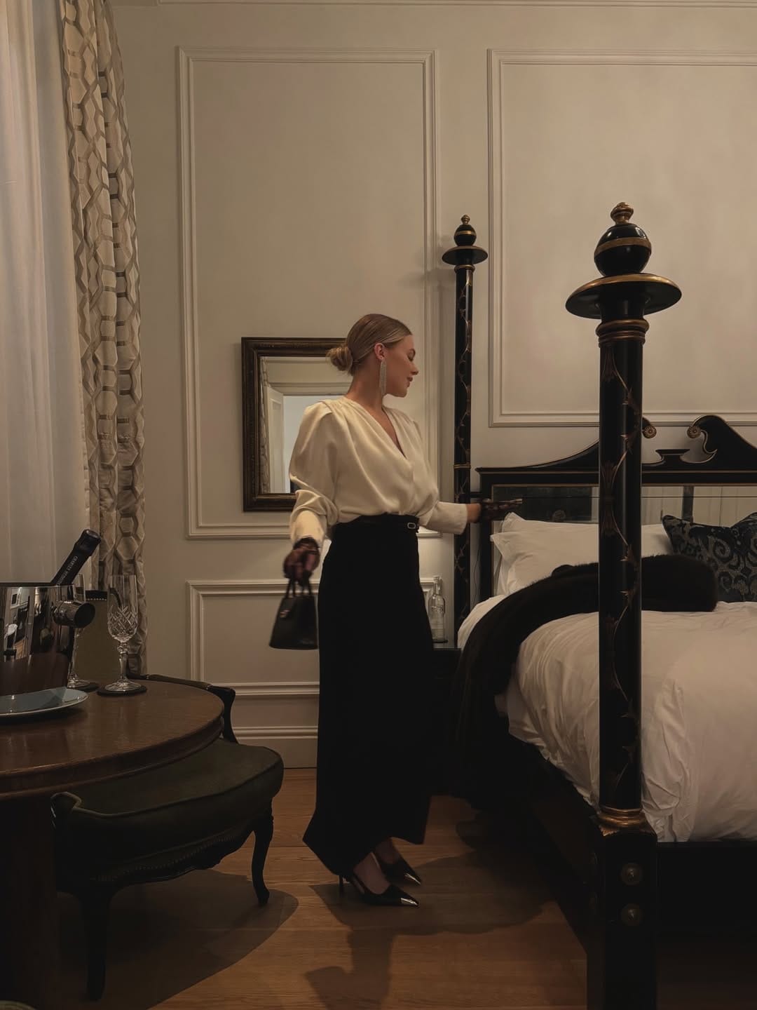 @ mildagudShe wears a flowing white wrap blouse tucked into high-waisted black skirt for poised contrast. The blouse’s draped sleeves and subtle sheen add soft sophistication to the tailored silhouette.
