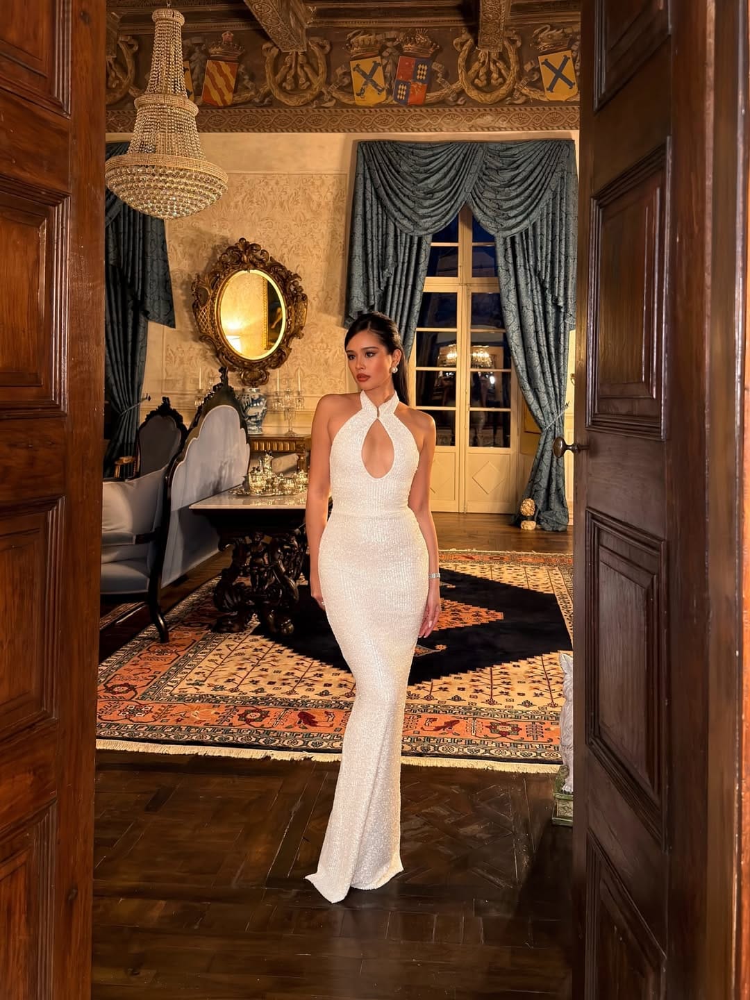 @ jarinpatShe wears a shimmering white halter gown with a high neckline and keyhole cutout for striking allure. The floor-length sequined fabric catches the light, draping elegantly over her figure.