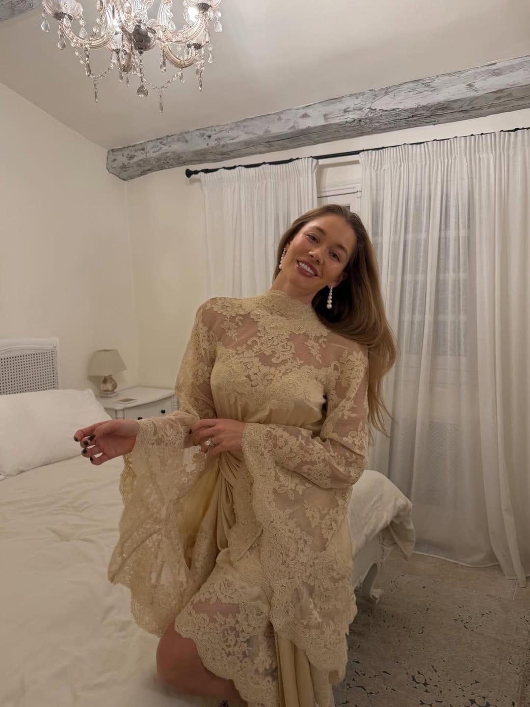 @ lovisabarkmanShe wears a romantic cream lace maxi dress with a high turtleneck and dramatic bell sleeves. Flared skirt and intricate lace overlay create an ethereal, bohemian flow.