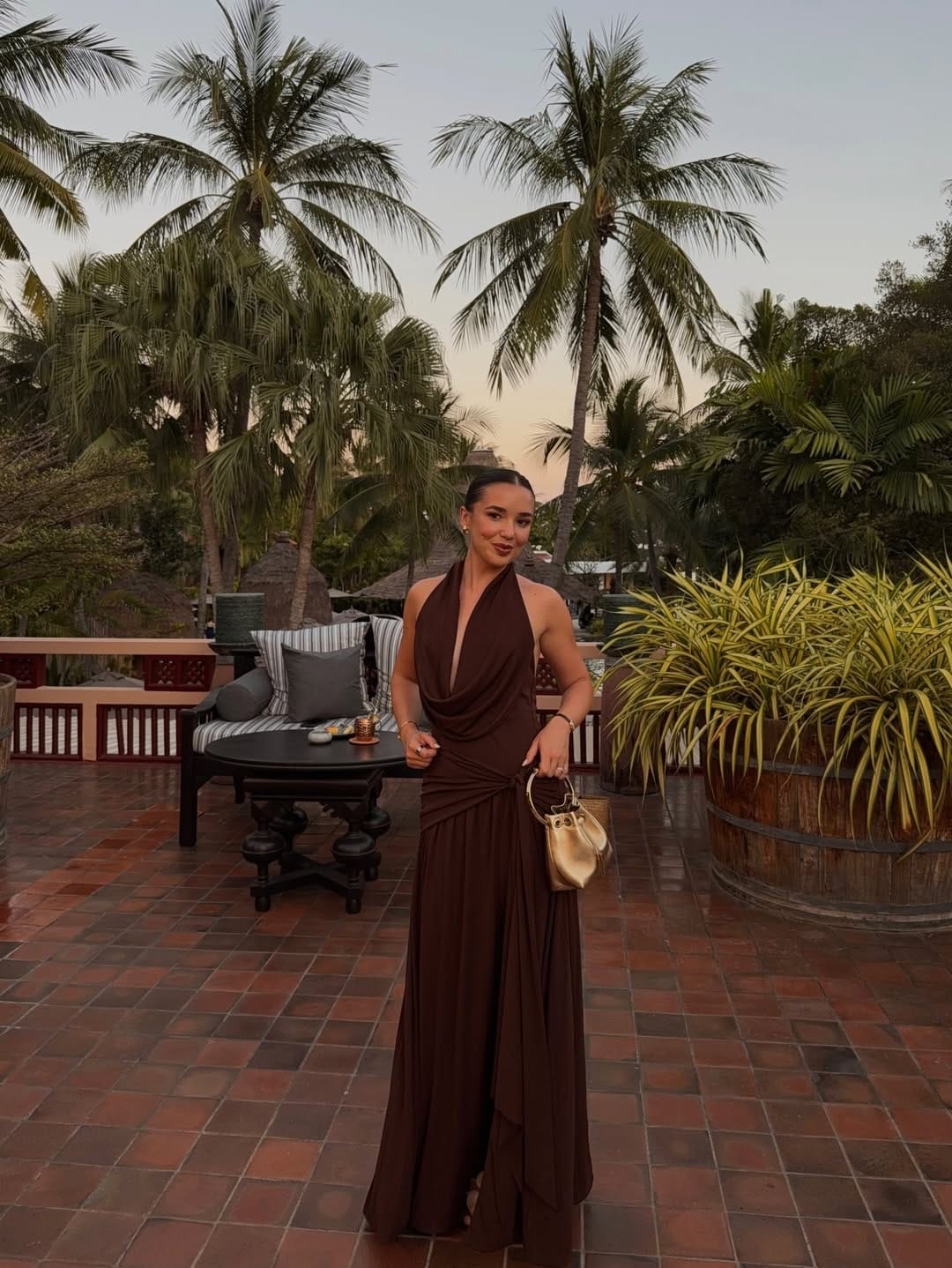 @ fleurraffanShe wears a rich chocolate brown halter gown with a deep V-neck wrap design that flows to the floor. The sleek satin fabric drapes fluidly, creating an elegant and sultry silhouette.