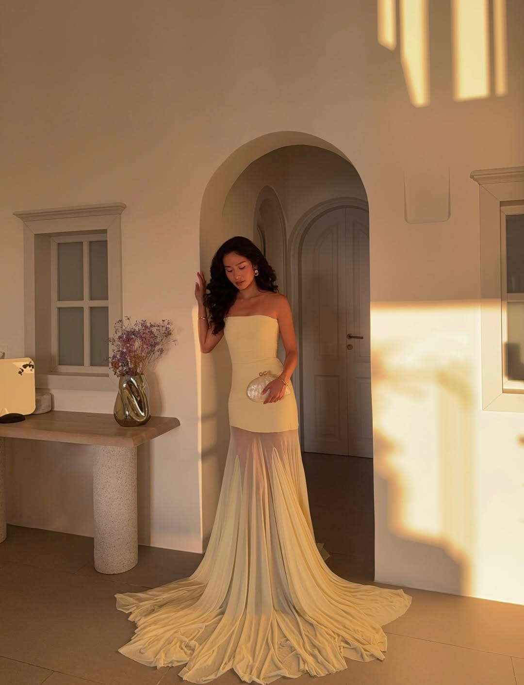 @ kristincabatShe wears a strapless sheer cream gown with a flowing, floor-length skirt. The delicate tulle overlay adds romantic volume and subtle glamour.