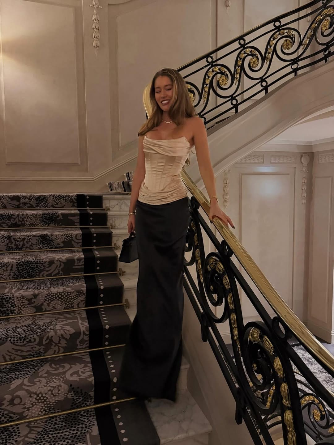 @ lovisabarkmanShe wears a strapless corseted cream top paired with a flowing black maxi skirt. The structured bodice cinches the waist, creating a feminine hourglass shape.