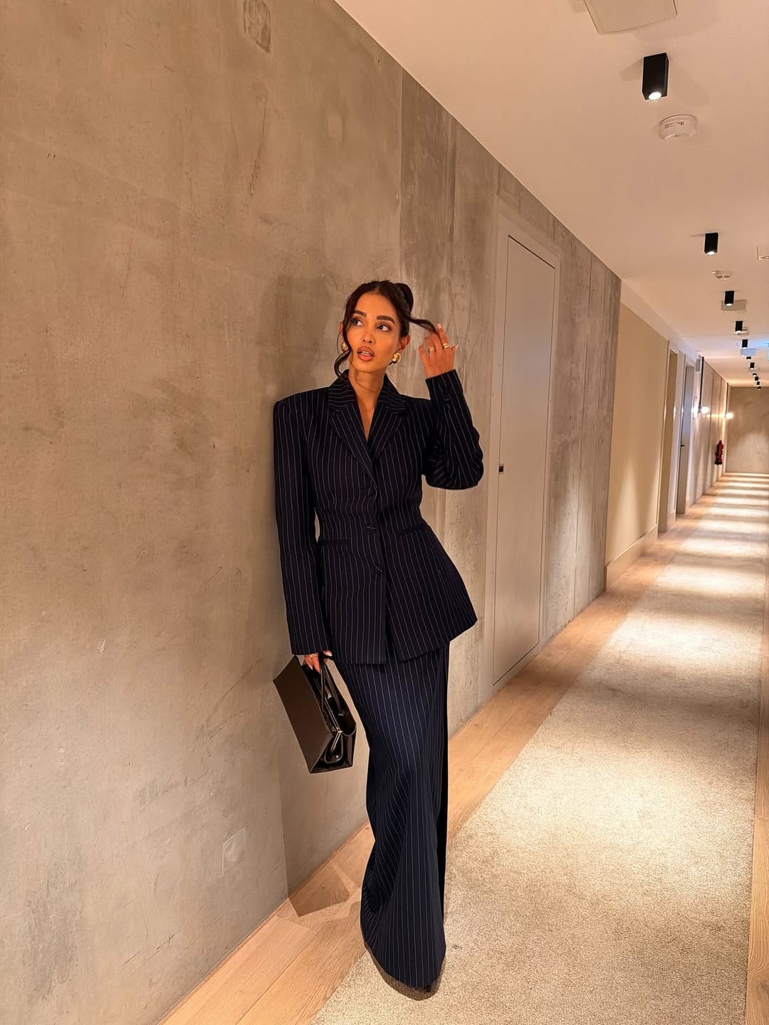 @ samira.sfiiiShe wears a tailored black pinstripe blazer with matching wide-leg skirt for sharp sophistication. Oversized shoulders and a floor-skimming hem elevate the power-dressing vibe.