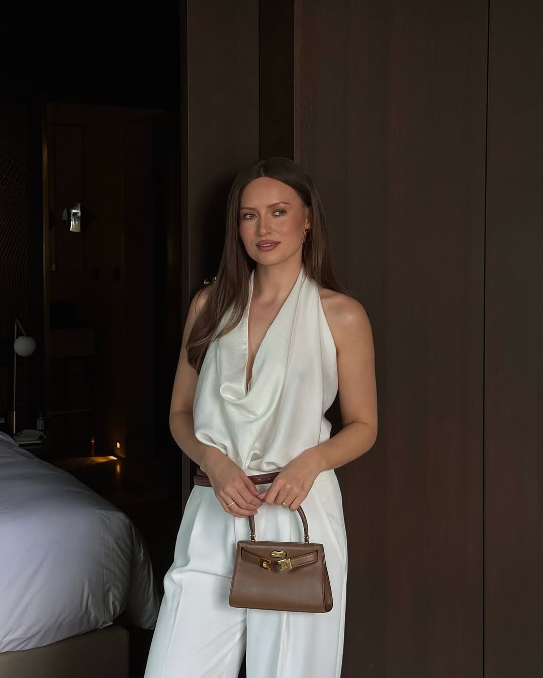 @ livia_auerShe wears a white halter jumpsuit with dramatic draped fabric forming a deep V-neck top. Wide-leg pants flow elegantly, cinched with a belt for a sleek, elongated silhouette.