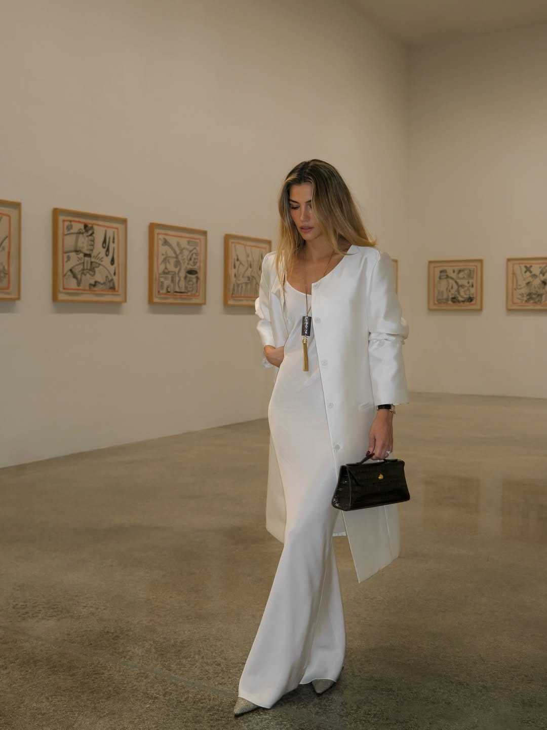 @ cassdimiccoShe wears a crisp white shirtdress-style coat dress with long sleeves and a sweeping floor-length hem. The minimalist tailored design offers understated luxury and graceful movement.