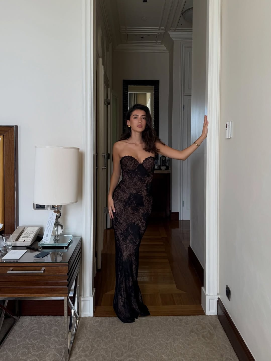 @ sherienboniShe’s channeling major femme fatale vibes in a strapless black lace maxi dress with intricate detailing and a sultry floor-length silhouette. Add hoop earrings and a bracelet for that effortlessly alluring date night glow-up.